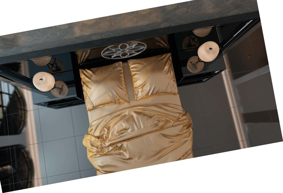 Md sophie 45 special headboard for your bedroom. Glossy black frame and panel. Add high quality and high elegance to your room with this stylish and unique piece of furniture. The panel comes with a very elegant rosette as an embellishment. The base legs are in silver gloss. The price includes the special headboard + the bed base (king/ queen) + the 2 side tables + items not included: bedding, lamps, dressers, mirrors, or any other item for decorative purpose. This bedroom set is available in queen or king size. See measurements below: headboard (125"-138") w x 55" h x 4" dimportant: queen size 125" w and king size 138" w. Bed base king: 80" w x 82.7" l x 14" h / queen: 64" w x 82.7" l x 14" h. Sideboard 24" w x 16" l x 20 h. Everything is made in Spain, European brand.