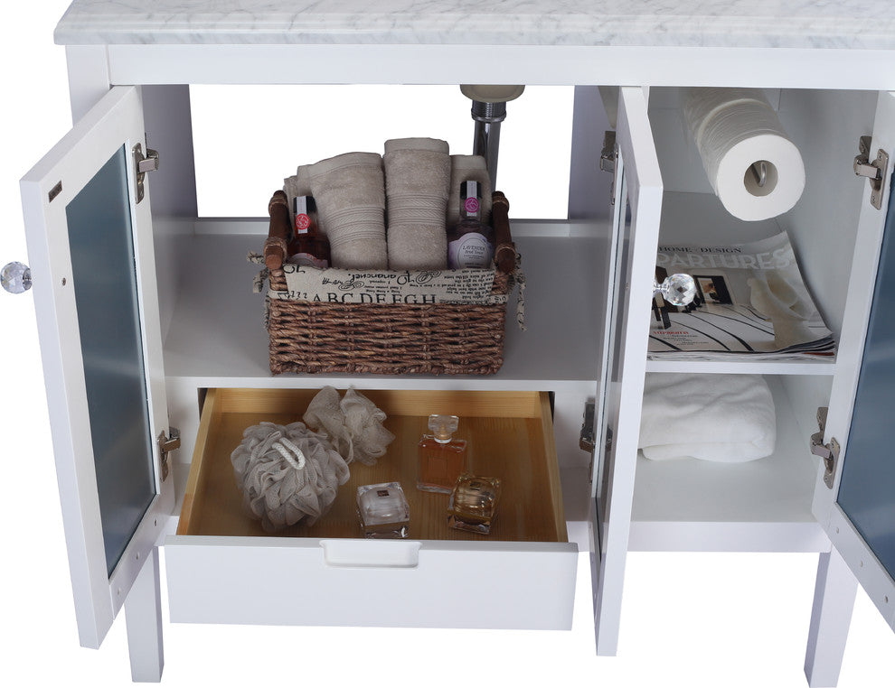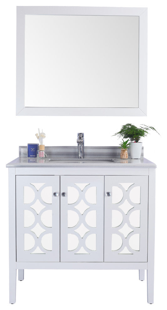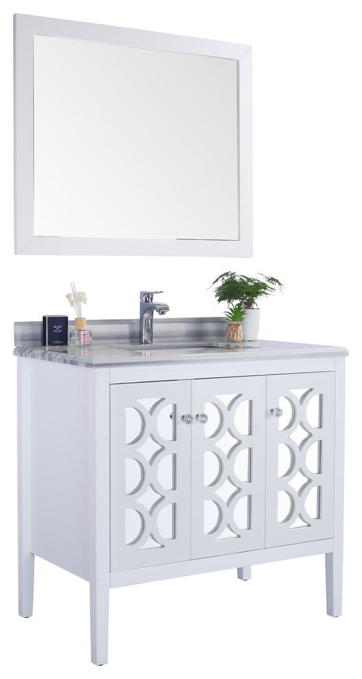 Mediterraneo - 36 - White Cabinet + White Stripes Marble Countertop313MKSH-36W-WS Mediterraneo - 36 - White Cabinet + White Stripes Marble Countertop, Presenting the Mediterraneo Collection, if you re going for the Putting on the Ritz look, with a nod to classical vintage, this look brings its classic relevance to today s bathrooms. The Mediterraneo vanity features a real wood cabinet with doors that showcases classical cut-outs, layered onto a mirrored glass background. As you reach for the crystal glass knobs on the cabinets soft-closing doors, they open to an open bottom platform which contains a surprise hidden drawer with soft closing rails. Style and functionality have indeed married and produced this fantasy beauty, come to reality in two finishes: Grey and Classic White. Still seeking more storage? A coordinating tall side cabinet commands your attention and completes the ritzy elegant look.Model No : 313MKSH-36W-WSSolid Oak Wood and Plywood ConstructionSoft Closing Doors and DrawersMarble CountertopUndermount cUPC 20" rectangle ceramic sink3.2" matching backsplashAdjustable FeetSingle Hole Faucet Mount (Additional Holes Upon Request) Crystal HandlesVanity Comes Pre-assembledDovetail Drawers