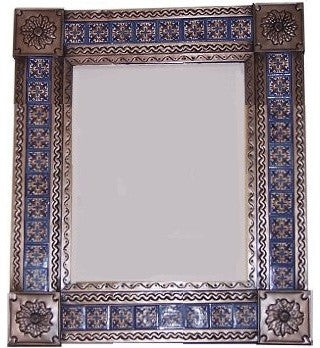 This is a medium-size tin mirror, the actual glass mirror measures 18.5 x 14.5", and the frame is about 5" wide on each side. It is fully decorated all the way around its frame. These decorations are known as punched tin. In the frame central part has hand-painted Talavera style arrow tile which has a white background and a lot of light blue.This mirror will delight your home d?cor. It will fit any dressing area such as your bathroom or a hallway. On each corner it has a square with a flower in the center. All of it in a single piece of tin. A piece of art that you will be delighted with, and proud to hang it on your walls."Hand-hammered and mold-cut to perfectionHandcrafted by Mexico''s Finest ArtisansWe include 1" long brown screws in all of our hammered copper switch plates