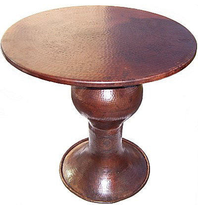 This hammered copper table will delight your home decor. The hammer marks are very visible, these marks are handmade on the copper sheet and the copper sheet is mounted in a compressed wood block to give body to the table. The finish is dark antique copper. There are two options to chose from in the base. One is black wrought iron made and the second one is copper made, both shown in the detailed pictures. The height is different in both options: The wrought iron is 20" tall and the copper is 30" tall. Please let us know which one you prefer.From a hammered copper sheet the wise artisan hands transform it into this unique piece. The reddish/oxidated texture is characteristic of copper when it is cooled down from red-hot temperature using cold water, technique that the coppersmiths use. This beautiful hammered copper table will add a unique accent to your high-end stile house, either on the living room as a center piece, your kitchen as a breakfast table or in any imaginable place in your home this table will delight your senses and your visitors"² and friends"².Hand-hammered and mold-cut to perfectionHandcrafted by Mexico''s Finest Artisans
