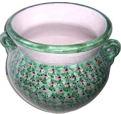 This pot has a Mexican white background, but mostly handpainted in a pattern given by nature: The peacock. The feathers are multicolred in green, orange, and blue with some black spots showing great detail. A unique addition to your garden landscape! The dimensions shown are overall dimensions, the pot opening is 10 diameter.Talavera Ceramic pots have a drilled hole at the bottom; this enable them to be used as a planter. If you plan to use them for this purpose, we recommend to use a smaller plastic planter to put it inside; this will prevent rusting to happen and will give a longer life to the pot. This ceramic pot is just an example of the exquisite beauty the Mexican craftsmen put on each item they create. It is handcrafted and handpainted, which means that no pots are the same! There might be small differences in size, weight and even the paintings. If you want to delight somebody special with an unique handcrafted gift, this is what you are looking for!"Hand-hammered and mold-cut to perfectionHandcrafted by Mexico''s Finest ArtisansWe include 1" long brown screws in all of our hammered copper switch plates