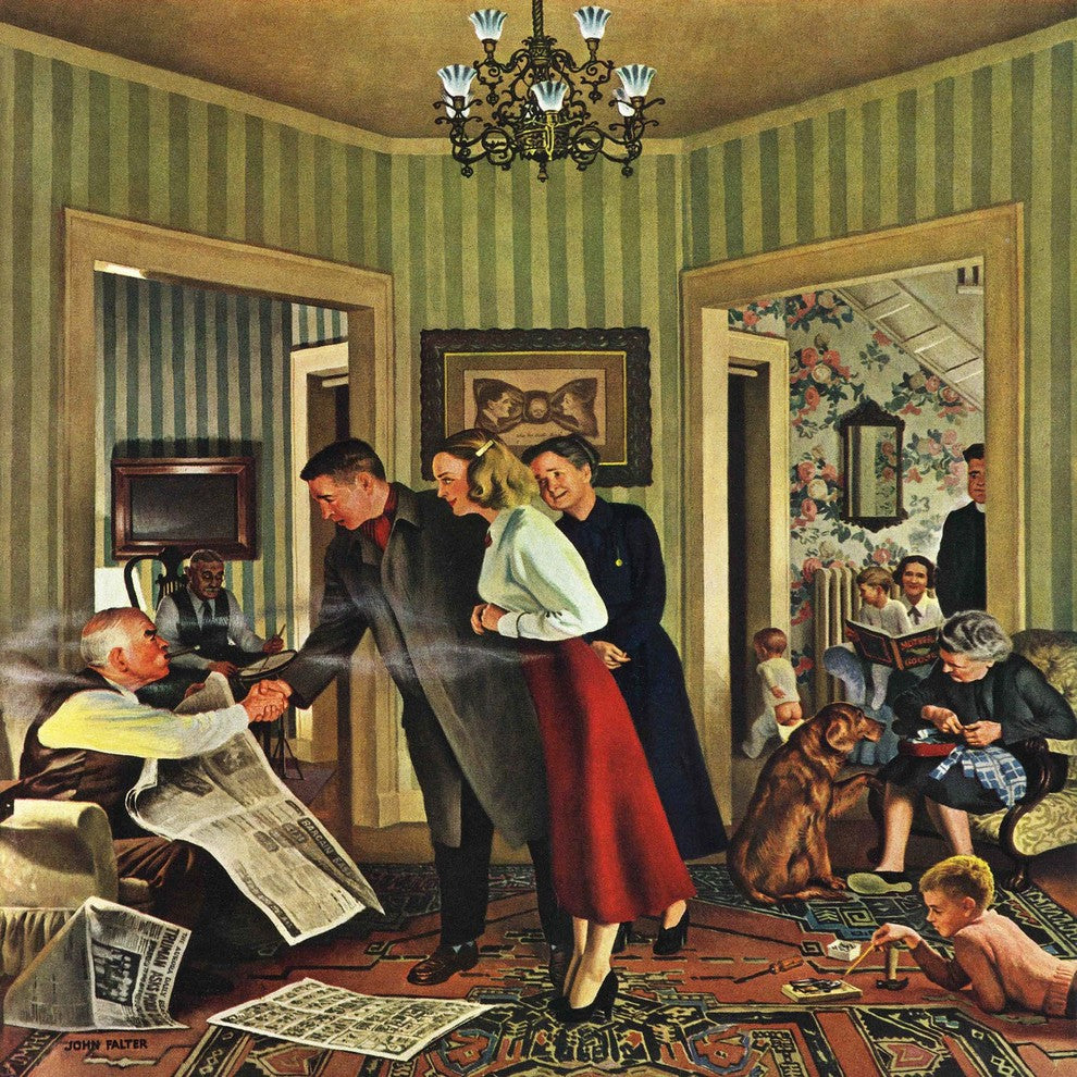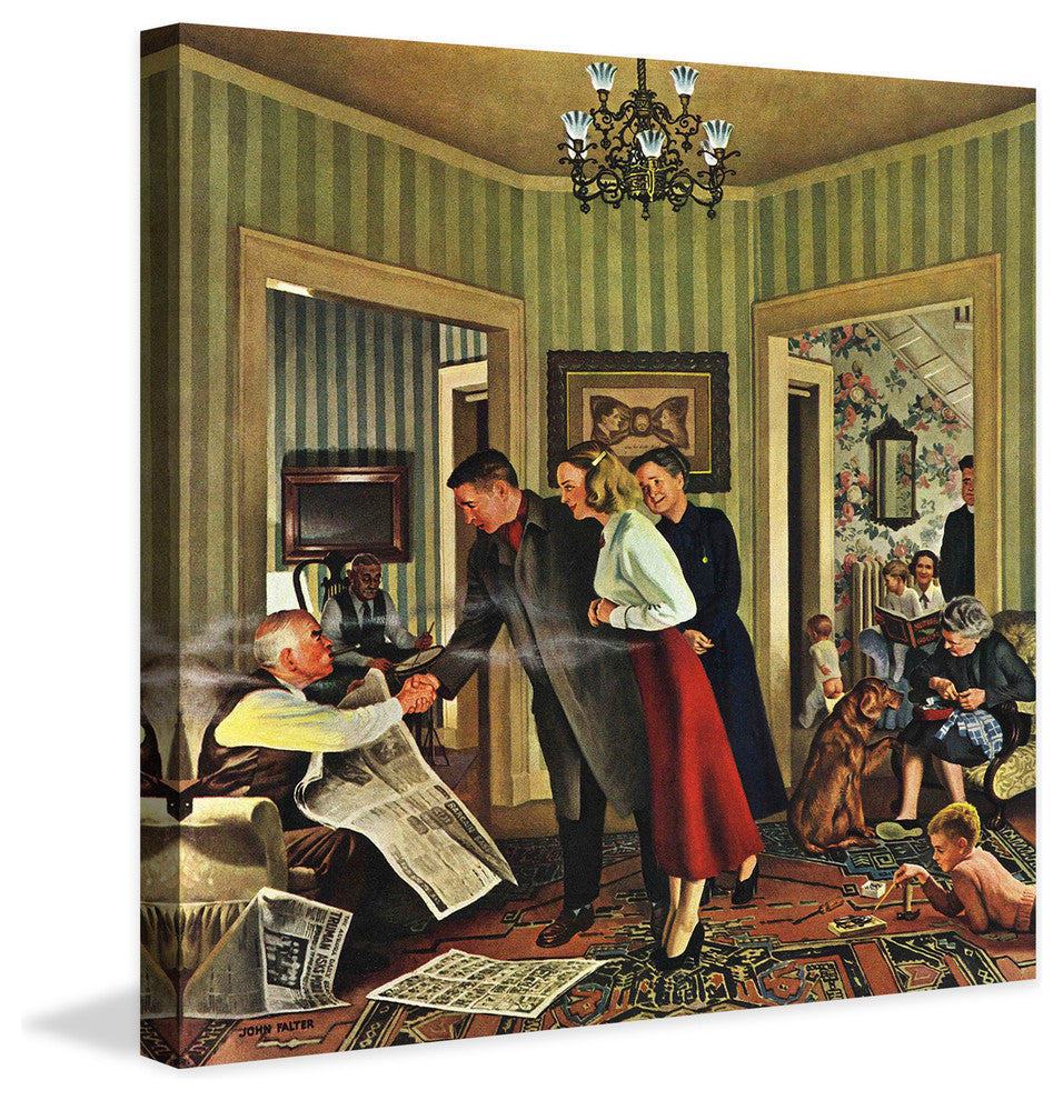 "Meeting the Date" Painting Print on Canvas by John Falter features vivid tones and supple artistry. Printed on canvas, this 18 inch wide by 18 inch tall piece will be an exceptional addition to any room. Fine art canvas print from the Marmont Hill Art Collective Professionally hand stretched Gallery wrapped in sustainable, non-warping wood Arrives ready to hang Made in the USA Includes a certificate of authenticity