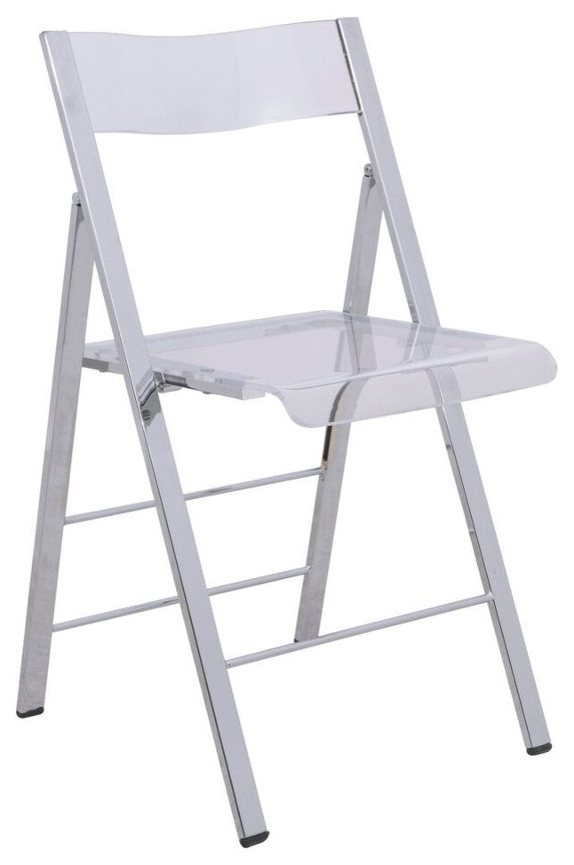 Item Specifications:.The chair features a high-quality acrylic seat and backrest, offering a blend of durability and sleek aesthetics. This material ensures long-lasting performance while providing a modern, transparent look that complements any decor..Supported by a sturdy chromed iron base, this chair guarantees exceptional stability and strength. The chrome finish adds a touch of sophistication and resists corrosion, ensuring the chair remains stylish and robust over time..Designed with convenience in mind, this chair is lightweight and foldable, making it easy to move and store when not in use. Its compact folding design is perfect for small spaces and allows for hassle-free storage..Each leg is equipped with plastic cap floor protectors, safeguarding your floors from scratches and scuffs. These protectors ensure your flooring remains in excellent condition, even with regular use and movement of the chair..The chair''s curved backrest and waterfall-edged seat are ergonomically designed for maximum comfort. The curved back supports your spine, while the waterfall edge reduces pressure on your legs, making it ideal for extended periods of sitting..Built for everyday use, this chair is easy to maintain with its high-quality materials and thoughtful design. Simply wipe it clean with a damp cloth to keep it looking new, making it a practical choice for busy households or commercial spaces..Ready to use right out of the box, this chair requires no assembly. Its hassle-free design saves you time and effort, allowing you to enjoy its comfort and style immediately.Item Dimensions:Overall: 30" H x 17.75" W x 16.5" DSeat: 18.5" H x 15" W x 16" DItem Weight: 14.2 lbsItem Description:The LeisureMod Menno Modern Acrylic Folding Chair with Chrome Frame is the ideal solution to your seating woes. Fashioned with a high-quality acrylic seat and backrest, and a sturdy chromed iron base, this chair is lightweight and foldable for easy storage. Its curved backrest and waterfall-edged seat provide comfortable support, while its plastic cap floor protectors ensure your floors stay protected. Designed for easy maintenance and daily use, this chair requires no assembly, making it a must-have addition to your home.