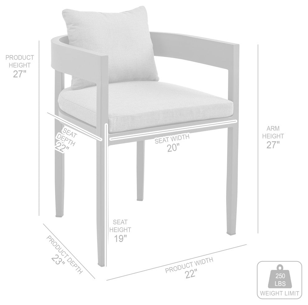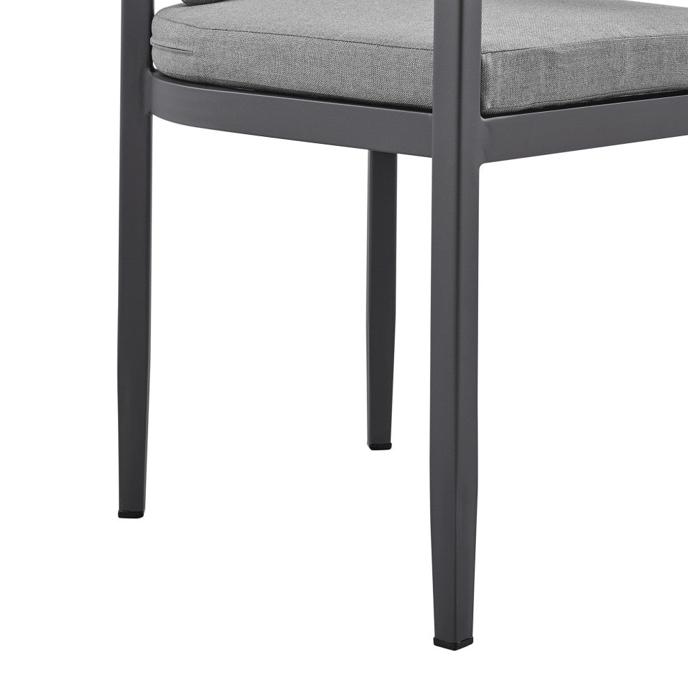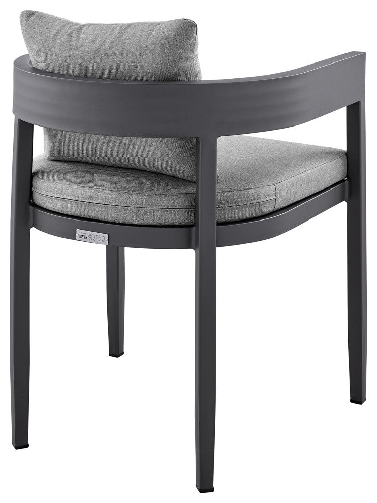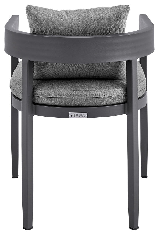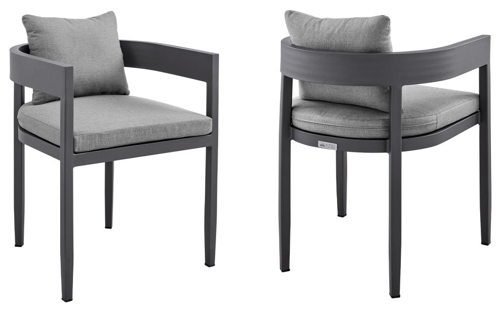 Create an inviting and sophisticated setup for your outdoor space with the Menorca outdoor dining chairs "“ set of 2 from Armen Living. Featuring a modern and elegant design, these outdoor chairs remain a versatile addition to any setting. These patio dining chairs embrace a barrel silhouette to wrap you in comfort. The dark grey cushions are removable and feature a zipper closure, making clean up a breeze! This outdoor furniture dining chair set features high-quality materials that come together gracefully for a look that is well-suited to your backyard, patio, pool area, garden, or screened in porch. Lightweight and durable aluminum framework make the Menorca outdoor chairs with cushions are easily portable and feature a multi-layer powder coating for further effective protection from the elements and everyday wear and tear. This is a perfect set of chairs to use indoors and is treated to withstand being outdoors. Without having to worry about UV, rust, or weather damage, the Menorca chairs are ideal for your home, regardless of your location. The Menorca outdoor dining chairs are sold as a set of 2 and can support up to 308lbs per chair. Available in a dark grey powder-coated finish with dark grey cushions, the Menorca chairs have a seat height of 19 inches.