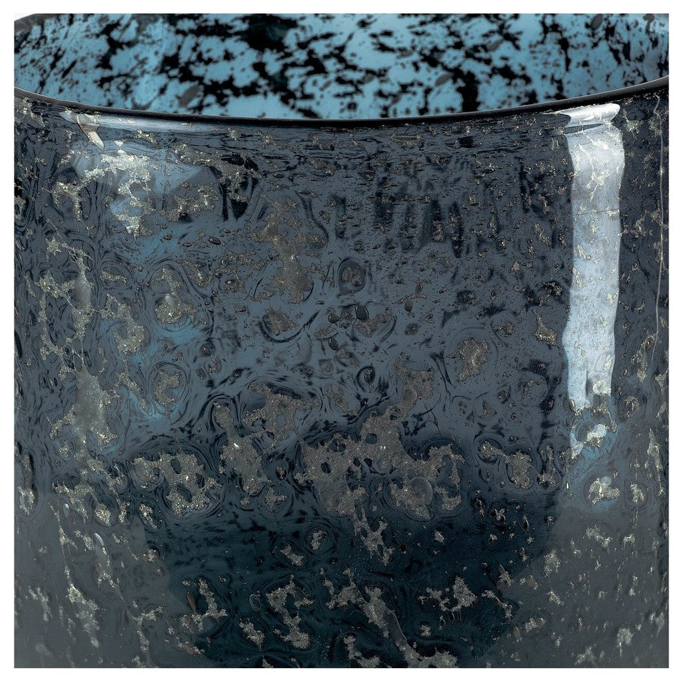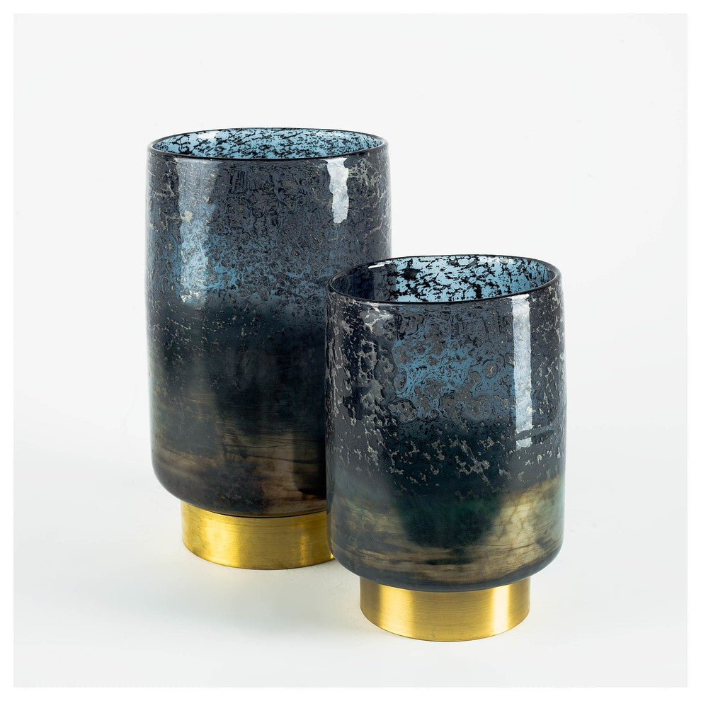 The Caspian pairing of open top glass vases, features a brass metal bottom which supports a beautiful and uniquely styled blue and antiqued brass finished glass.