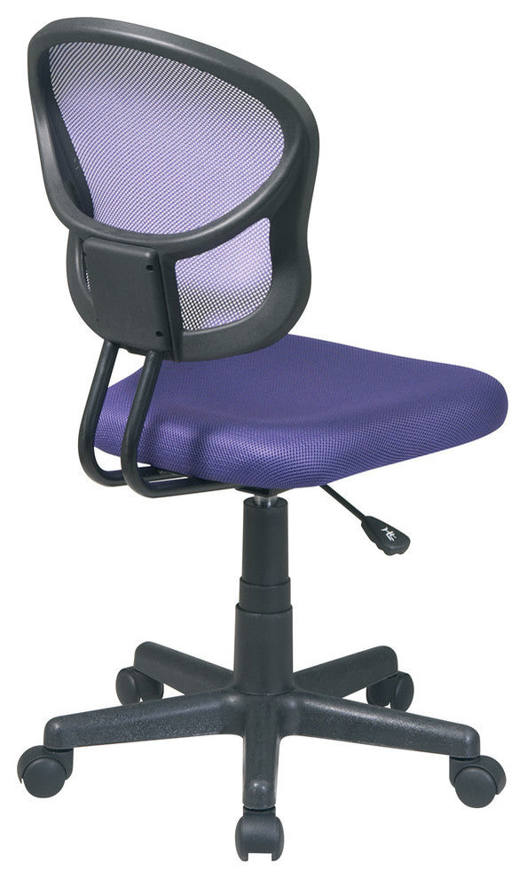 Mesh Task Office Chair in Purple Fabric by OSP Home FurnishMesh Task Office Chair in Purple FabricA task chair with a functional yet playful appeal arrives in the new Mesh Back and Padded Seat Desk Chair by OSP Design. Outfitted with a pressurized seat height adjustment and available in a variety of fun colors, this seating solution makes the perfect addition to any home office that begs for a pop lively appeal. Intelligently engineered with a pressure-responsive mesh back and padded mesh seat, this chair wicks away moisture while keeping your back comfortably cradled. Boasting a 360-degree swivel and armless design, this chair is perfect for doing homework at your computer desk or checking emails at your home workstation. Couple all of these features with the heavy-duty dual wheel carpet casters and you have a versatile task chair that is as affordable as it is comfortable.Features: • One Touch Pneumatic Seat Height Adjustment • 360 Degree Swivel Mesh Task Chair • Heavy Duty Nylon Base with Dual Wheel Carpet Casters • Outfitted with a pressurized seat height adjustment • This chair wicks away moisture while keeping your back comfortably cradled • Armless design, this chair is perfect for doing homework at your computer desk or checking emails at your home workstation. • Intelligently engineered with a pressure-responsive mesh back and padded mesh seatSpecifications: • Chair Dimensions: 18"W x 20.25"D x 38.5"H • Chair Weight: 15 lbs • Chair Weight Capacity: 200 lbs • Seat Dimensions: 18"W x 17.5"D x 2.5"T • Seat Height: 17" - 21.5" • Back Dimensions: 16.5"W x 17.5"H