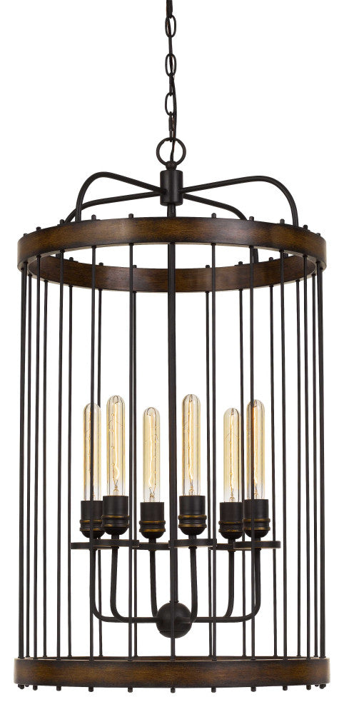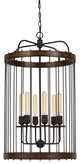 This rustic metal and wood chandelier is a wonderful addition to any kitchen, living room or dining room setting. It features a smooth dark bronze finish with stained wood accents . It ships with matching canopy and six feet of cord which can be adjusted to the desired length.