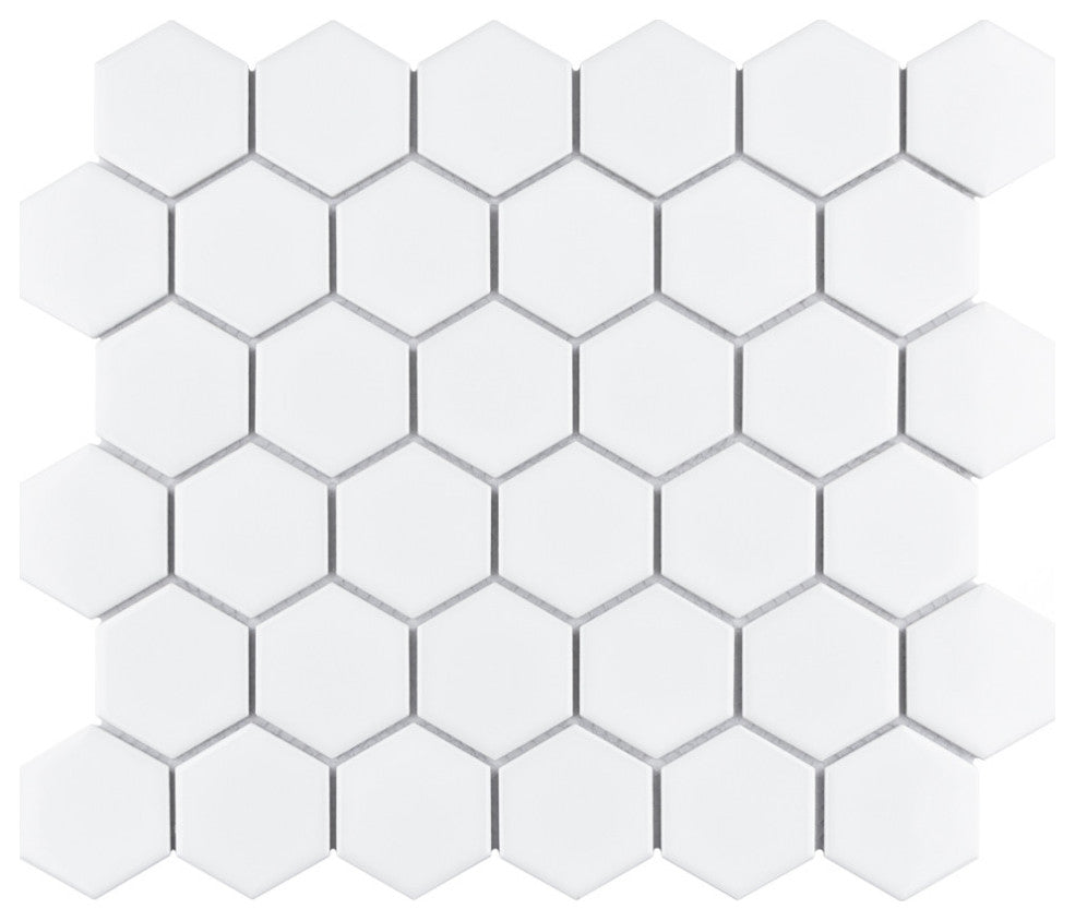 Metro Hex Matte 2" Porcelain Mosaic Floor and Wall Tile, Matte Grey, Glossy White