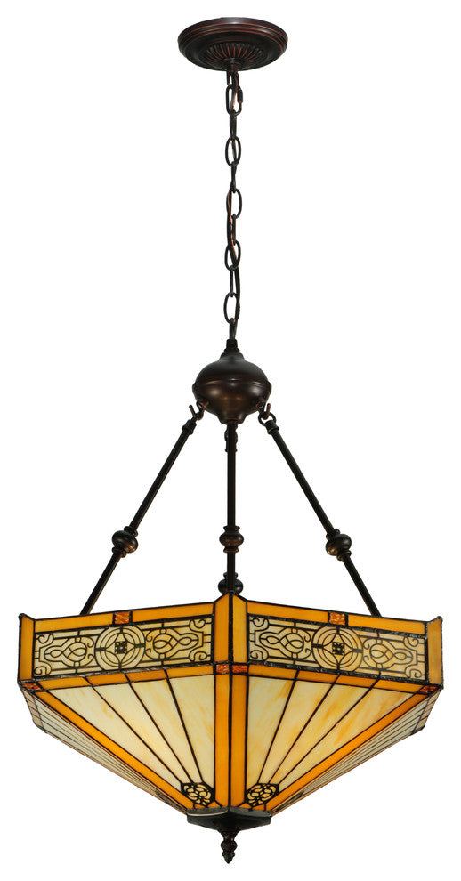 Honey stained glass strips accent Beige art glass panels of this hexagonal shaped shade, which is highlighted with decorative brass details on the shade''s skirt The small center square pieces of glass feature Sunburst and Amber accents The shade was constructed using Meyda Tiffany''s famous copperfoil construction process The hardware is finished in Mahogany Bronze