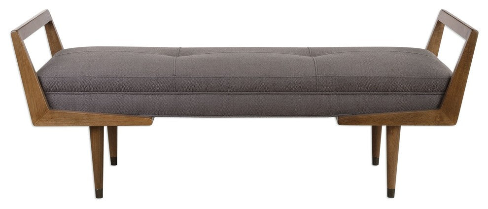 Midcentury Modern Exposed Wood Frame Bench, Tufted Gray Brown Retro Long
