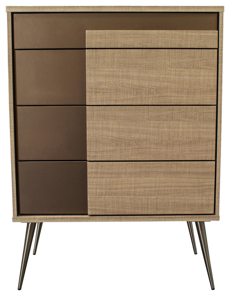 Give your bedroom and more midcentury world design with this Brazil collection. The wood is made of MDF Board, High Gloss, PVC Laminate. All drawers come with metal side rails. All legs are made of chrome. This bedroom set is constructed of eco-friendly and will give your bedroom a more retro and midcentury modern style.Dimensions:4 Drawer Chest 31.5"L x 19.5"D x 43.5"HIncludes: 4 Drawer ChestColor: Taupe BronzeMaterial: MDF Board, High Gloss, PVC LaminateAssembly Required