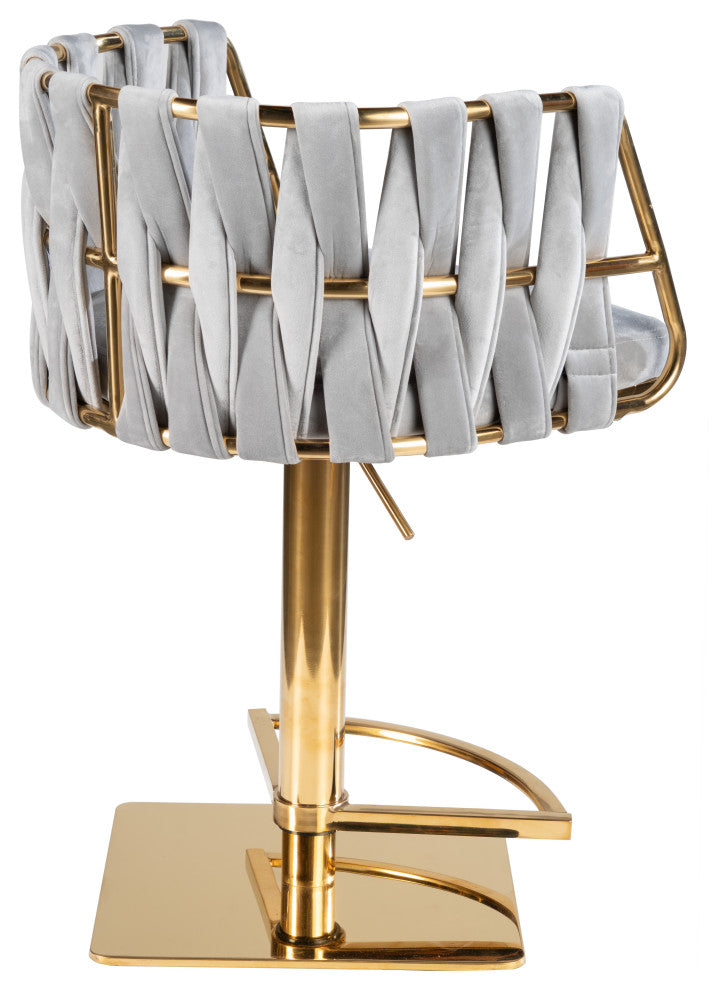 Weaved velvet fabric and gold steel legs create this chair with a sleek design.You can use this swivel and adjustable chair at any seat height between 22" and 32"Materials: Stainless steel, velvetMeasurements : 20.5"w x 21"d x 40" h, 35 poundsSeat measurements: 18.5"dx18.5"w, Back: 9.5"hFootrest: 13.5"h from the floor when the seat height is 32"Seat height changes between 32" to 22"Color: Gray, silver