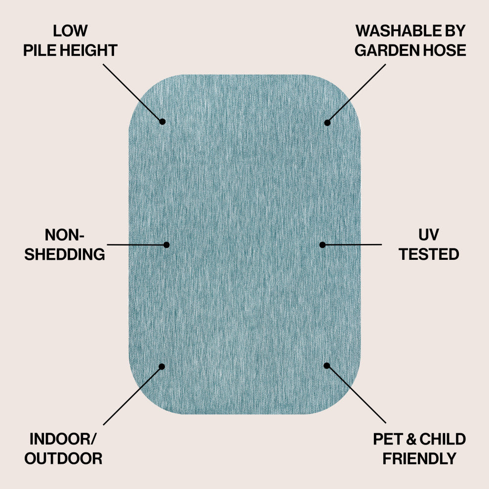 This modern outdoor rug adds a simple style with curved corners and bold solid color. Woven from synthetic fibers, this easy-care rug has a casual, coastal vibe. Use it outdoors on a porch, or in the living room, entry, bedroom or dining room.Features:• Transitional flat-woven design is just 0.15" thick• The solid turquoise color gives this rug an modern vibe• Durable woven construction is made from easy-care outdoor polypropylene• 100% Polypropylene• No backing, use of rug pad is recommended (sold separately)• Power Loomed in Turkiye• Actual Dimension: 6 ft. 2 in. x 9 ft.• Color: Turquoise• Thickness measures: 0.15 in.• Available in multiple sizes and/or colorsRug Care:• Vacuum regularly and spot clean as needed; avoid direct and continuous exposure to sunlight; use brushless vacuum; remove spills immediately; if liquid, blot with clean, undyed cloth by pressing firmly around the spill to absorb as much as possible; for hard to remove stains, professional rug cleaning is recommended; store in a dry, well ventilated area and rotate for consistent wear• Packing and shipping may cause temporary creases in rugs, which will flatten out after a week on the floor; to expedite the process, try back-rolling your rug before laying it down, and then allow ample time for the remaining creases to relax• Please Note: Due to differences in monitors, some rug colors may vary slightly. Lengths and widths may vary from the published dimensions. Patterns may vary slightly according to shape and size selected.About us:Style your floors with JONATHAN Y. By combining fine craftsmanship and design, this New York creative studio is bringing fashion to your floors. The collection mixes sustainable organic materials, vibrant colors and trend worthy styles to create JONATHAN Y''s distinctive catalog of rugs.