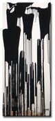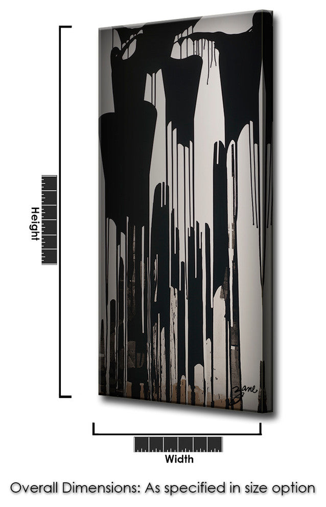 Salvatore Principe abstract ''Milk'' features warped black silhouettes; shaped like oozing, dripping wet ink. The obscure shapes are overcome by gravity as they stretch down the narrow canvas melting into one another. The backdrop, an incomprehensible setting, contrasts the depressed foreground with an off white slate accented by a small precipice of beige at the foot. Handcrafted in the United States, this gallery-wrapped canvas art arrives ready to hang on your wall.