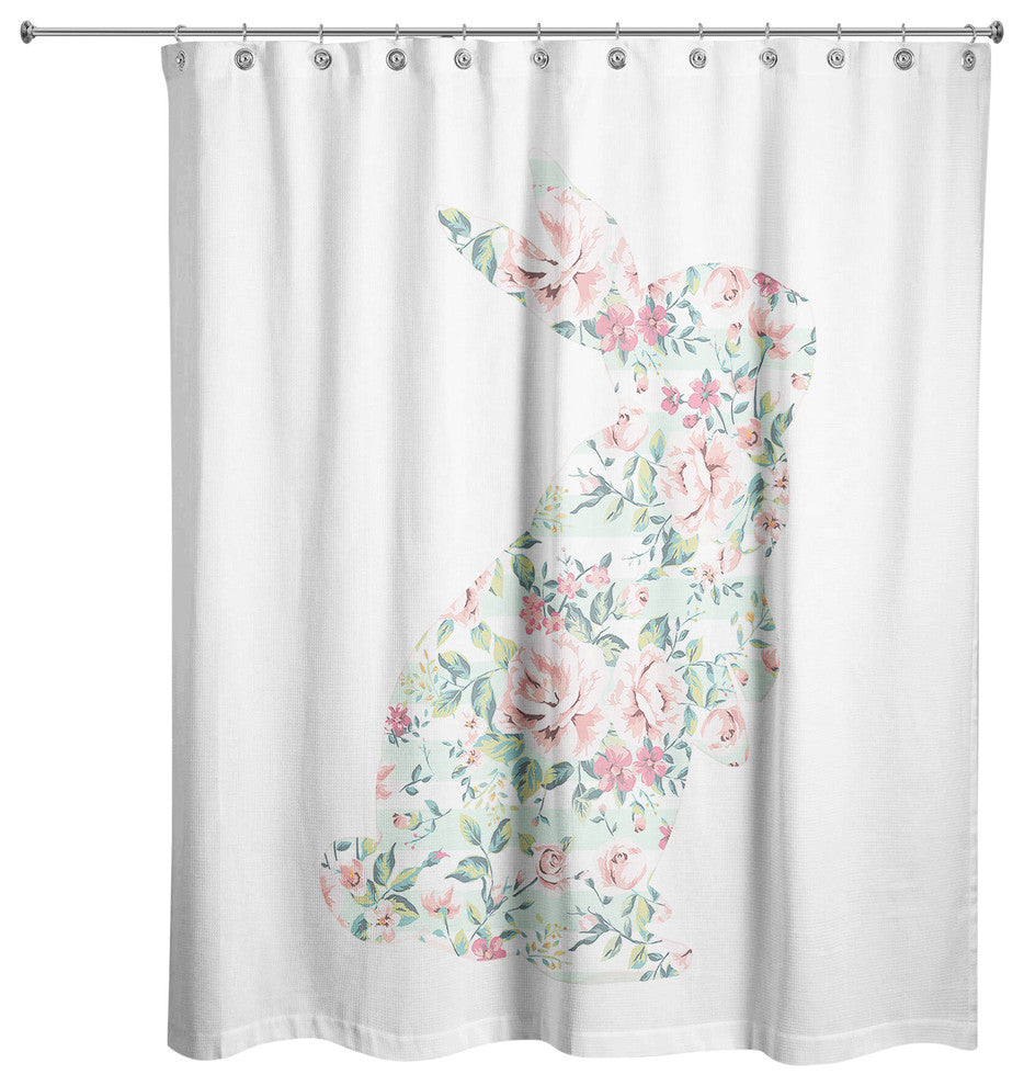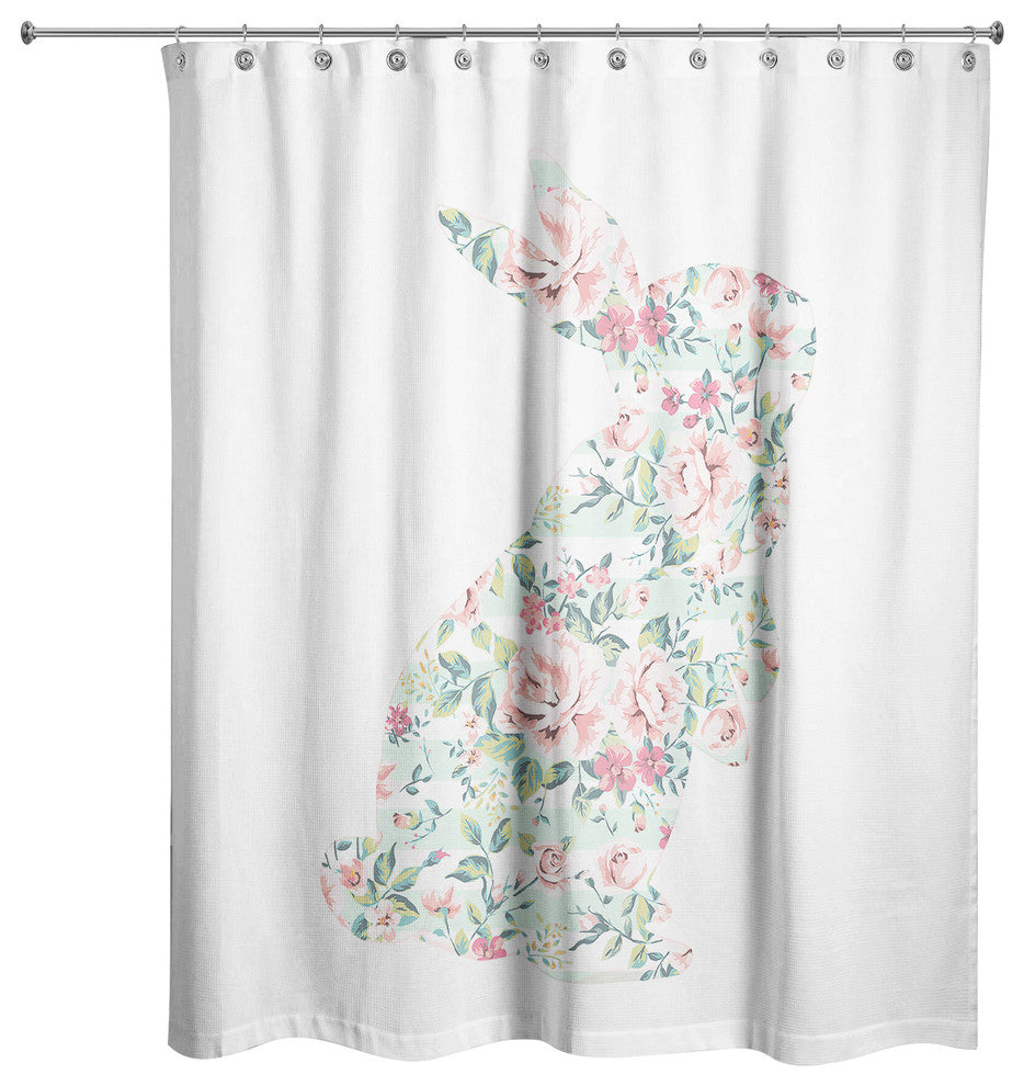 Infuse your bathroom with Spring design by adding this Mint Floral Curious Rabbit 71x74 shower curtain to your interior. Our shower curtain designs allow you to express yourself and add a fun and unique touch to freshen up your bathroom for the warmer months. Shower curtains are made stitched enforced eyelits for hanging. Grommets, hooks and rod are not included.