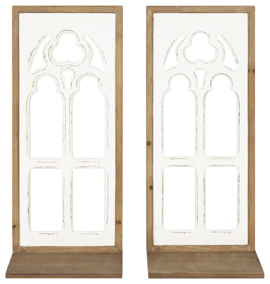 Decorate your walls with a tasteful farmhouse vibe that is both sophisticated and functional. The Mirabela sconce set from Kate and Laurel proudly showcases its classic, windowpane-inspired look and sets the aesthetic for every room. It is a decadent piece reminiscent of cathedral window wall decor with elegant panels and a two-tone white and rustic brown finish. The material of these sconces is a solid fir wood, distressed by hand to give you a one-of-a-kind, artisan look that is uniquely yours. Each sconce has a five-inch shelf with a weight capacity of three pounds, providing an excellent surface for flameless candles, small succulents, or framed photographs. As robust, rustic wall accents, these sconces look fantastic side by side, flanking a rustic wall mirror, or staggered throughout your home. They are excellent additions to any entryway, stairway, living room, bedroom, dining room, or kitchen. Each sconce assembles in a matter of seconds with easy-to-follow, two-step instructions and hangs on the wall with metal D-ring hangers securely attached on the back of each.