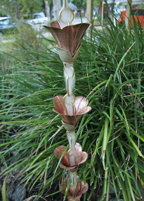 This spectacular chain is our newest addition! The Kanji Cups Rain Chain - Mixed Petals is a new design of both copper and brass metals, designed and patented in the USA by Garm Beall. The large flowers are pure copper and are supported by a thick hand cast brass base. The base is detailed brass. The flower cups are connected with pure brass links to create a gorgeous sculptural piece for your home, and functional too. As the chain patinas with age, the copper and brass will take on different tones of color for a truly beautiful and unique look. With a large central hole, this chain will handle diverse rainfall conditions. About Garm BeallGarm is an avid gardener and passionate about elegant, functional accents in both home and garden. He founded his company on the theme of creative functionality and superior customer service. His products are made from the highest quality and the thickest copper, brass, aluminum and iron materials. All cup styles are designed for the best water flow, even in heavy rainfall. Every chain comes with a gutter attachment piece - and they are easy to install! In general, cup styles will carry more water than link chains without splashing.What is a rain chain? The Kanji Cups Rain Chain - Mixed Petals is an elegant and charming addition to your home and garden, and Rainchains are a great alternative to gutter downspouts and traditional rain gutters. Ambiance is instantly transformed when rain water tumbles visibly down your rainchain, creating a beautiful waterfall sound. Copper rain chains are an artistic downspout that have been used in Japan for centuries and have only recently become popular in America.Pure copper flowers supported by thick hand cast brass bases.Rain Chain installation is simple and only takes a few minutes.Rain chains are an artistic downspout.Cups made of thick, pure copper & brass w/brass links.Includes 3" copper installation kit.Designed and Patented in the USA.Several Length Options Available.Free Standard Shipping!Cup Dimensions:Cup Width: 4 3/4"Cup Height w/ Base: 4 1/4"