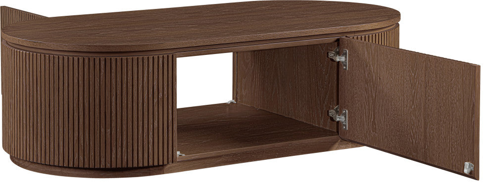 Indulge in the allure of the Brown Rubberwood Moana Coffee Table by Meridian Furniture. Its captivating design and luxurious Brown Rubberwood elevate any space with effortless elegance. Crafted with precision and durability in mind, this stunning piece becomes the focal point of gatherings, fostering moments of connection and warmth. Embrace sophistication and style with the Moana Coffee Table, a testament to exquisite taste and timeless beauty.Overall Product Dimensions: 52" W x 26" D x 15" HRich Brown Walnut FinishSolid WoodOak VeneerStorage Cabinet Inner Dimension 23.8" W x 24.8" D x 11" HFluted WoodContemporary Design