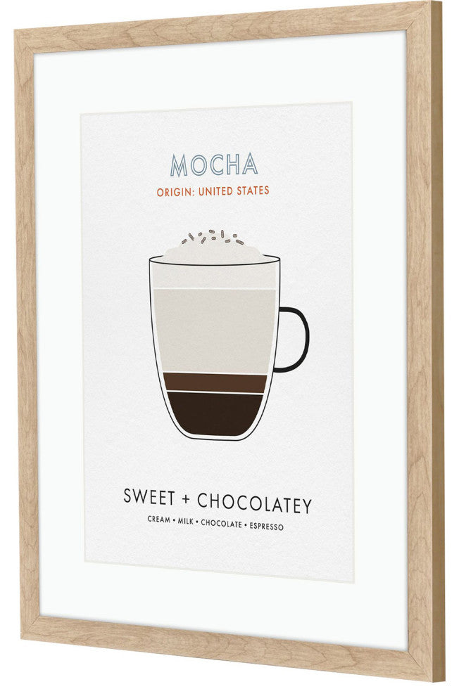 Wake up to a modern international coffee flavor print in neutral tones. Matted in white and framed in a sleek natural wood finish molding.