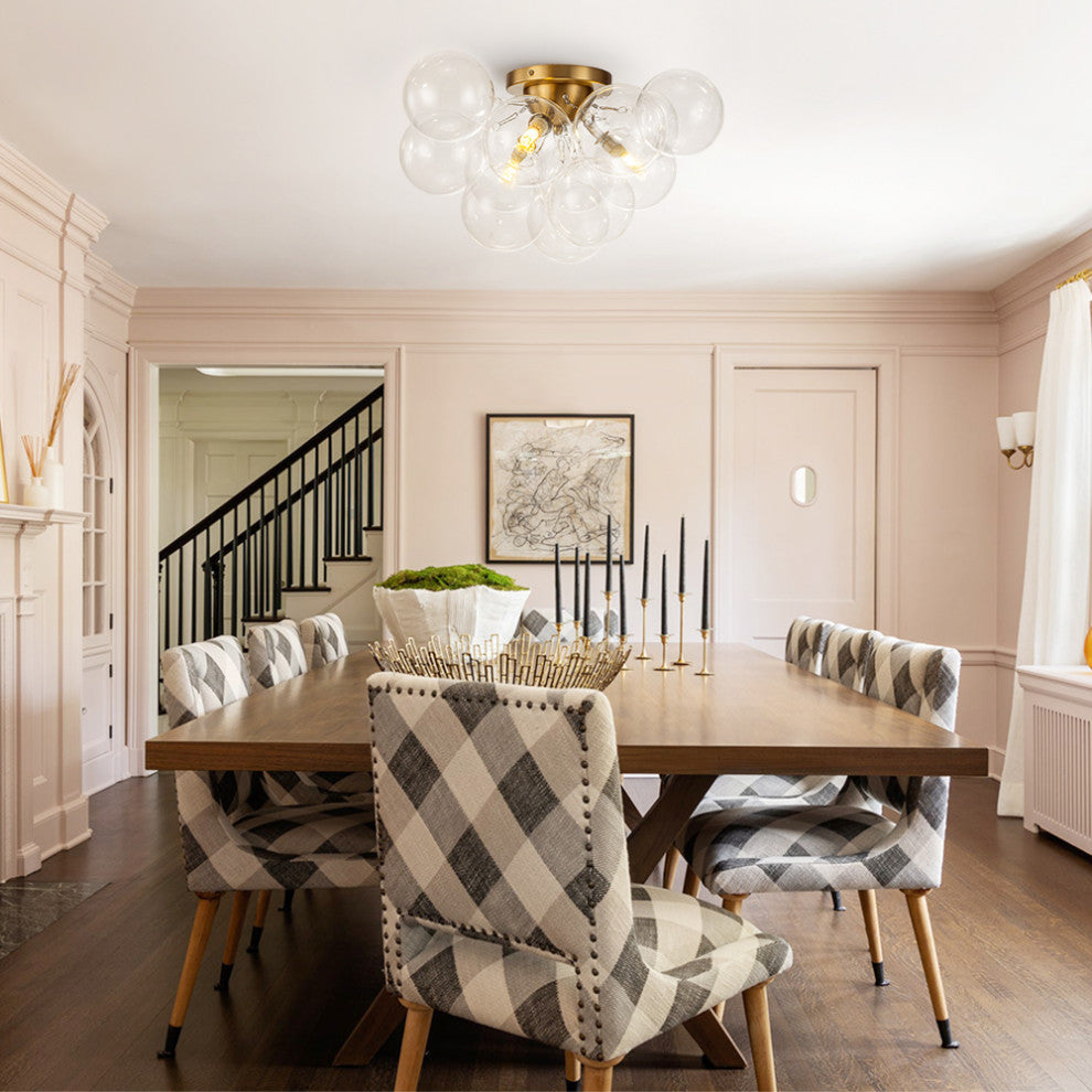 Elevate your space with the enchanting 3-light sputnik design clear glass bubble semi flush mount, a stunning fixture designed to add a touch of sophistication to any hallway or bedroom. It boasts a chic sputnik design, featuring several gracefully arranged hand-blown glass shades that evoke the elegance of softly floating clouds. The clear glass bubble shades create a captivating visual effect while providing ample illumination, perfect for brightening up your room. For added convenience, the fixture can be paired with a dimmer switch, allowing you to adjust the brightness to achieve a more personalized and inviting ambiance. This blend of style and functionality makes the 3-light cluster glass bubble ceiling light an ideal choice for enhancing the charm and warmth of your living space.