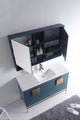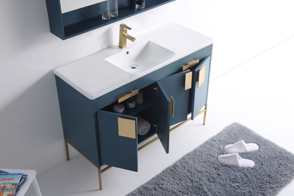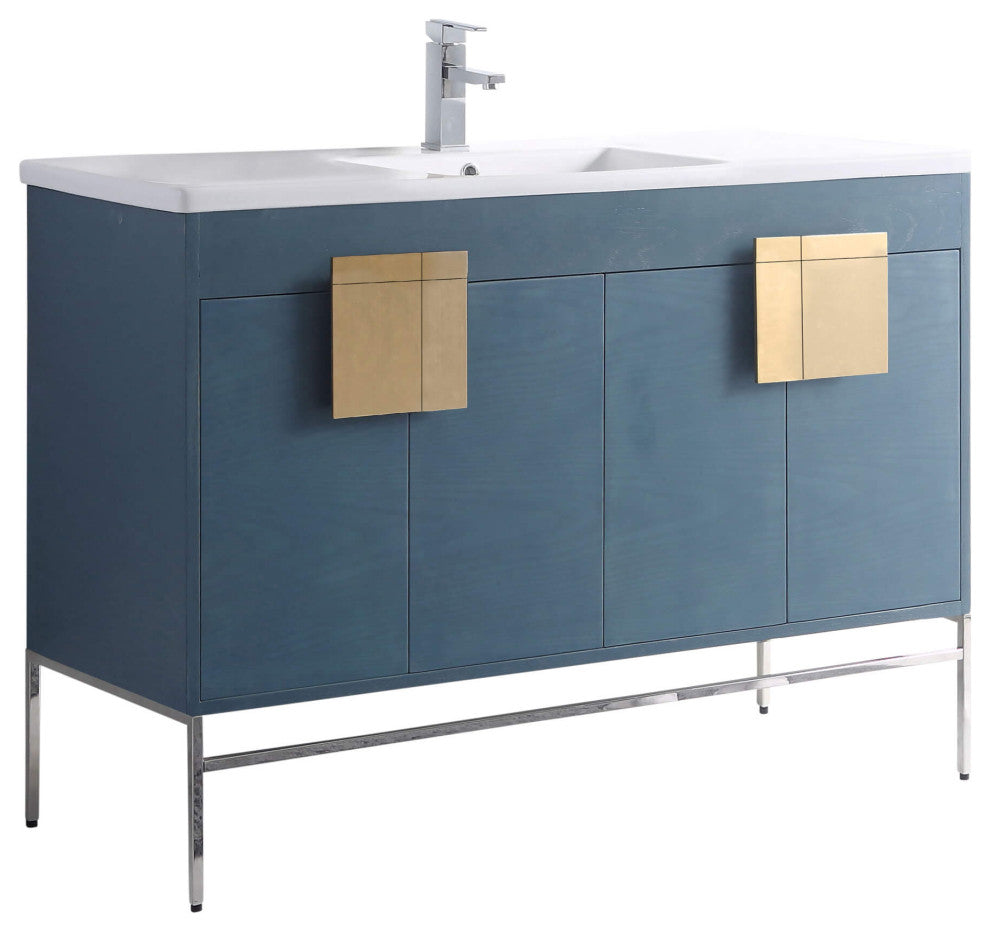 Modern Blue Bathroom Vanity Set, Satin Brass Hardware, Vireous China Sink Top