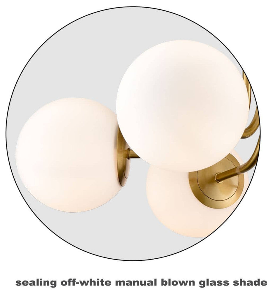 Crafted from globe off-white manual blown glass ,combination of electrophoresis brass gold metal finish,which can reflect the sparkling and even lighting ,adds more chic and luxury feeling .