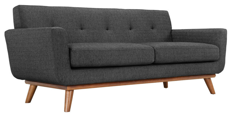 Gently sloping curves and large dual cushions create a favorite lounging spot. Whether plopping down after a long day at work, settling in with coffee and brunch, or entering a spirited discussion with friends, the Engage sofa is a welcome presence in your home. Seven tufted buttons create eye catching appeal; adding depth that brings your sitting decor to center stage. Four cherry color rubber wood legs and frame supply a solid base to the comfortable upholstered material.Cherry color rubber wood, White plastic glides100% polyester material, Chair Weight Capacity - 440 lbs.Overall Product Dimensions: 111"L x 123"W x 32.5"HArmchair Dimensions: 40"L x 33"W x 32.5"HLoveseat Dimensions: 78"L x 33"W x 32.5"HArmrest Dimensions: 4.5"W x 6.5"HCushion Thickness: 6"H