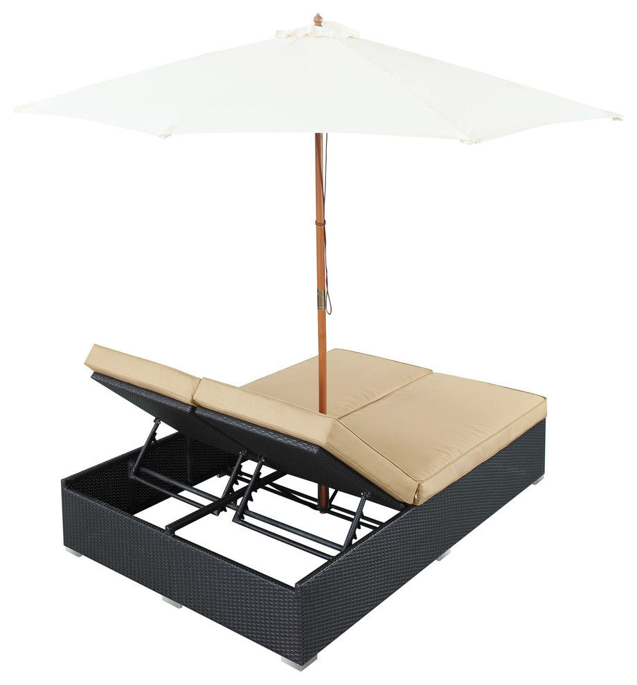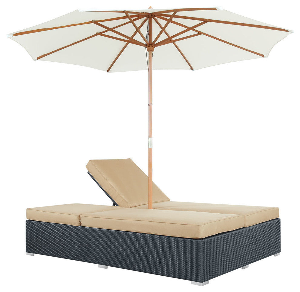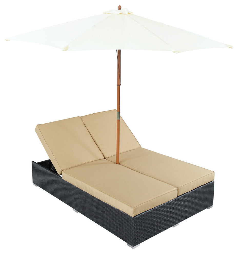 Life is full of first glimpses with the dual lounge Arrival set. Center your thoughts on uplifted efforts as you embark on pursuits both peaceful and grand. With recline adjustable chaise lounges, and an easy fold umbrella that provides shade from the sun, Arrival is a piece of stellar resolve. Arrival is comprised of UV resistant rattan, a powder-coated aluminum frame and all-weather cushions. The set is perfect for cafes, restaurants, patios, pool areas, hotels, resorts and other outdoor spaces.Dual Modern Chaise Lounges, Synthetic Rattan WeaveMachine Washable Cushion Covers, Powder Coated Aluminum FrameWater & UV Resistant, Ships Pre-AssembledOverall Product Dimensions: 105.5"L x 105.5"W x 13.5"HDaybed Dimensions: 82"L x 54.5"W x 13.5"HUmbrella Diameter: 105.5"L x 105.5"WSeat Height: 13.5"H