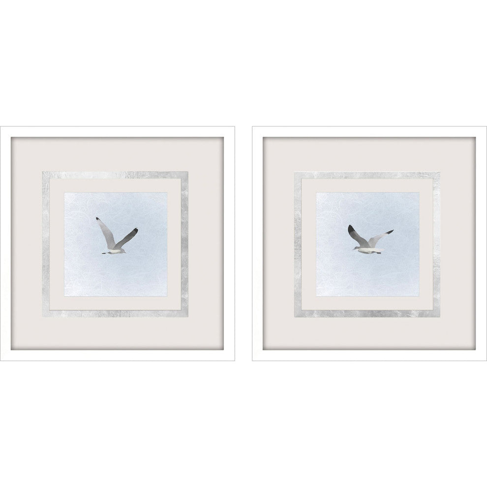 Graceful birds feature neutral matting with a hand applied silver leaf accent. Framed in a lacquered white wood shadow box style molding.