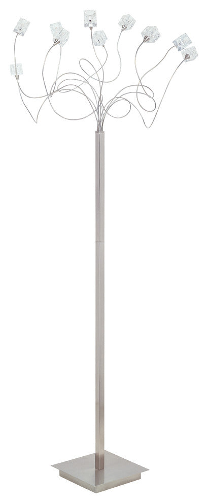 This modern floor lamp includes clear glass shades and is uniquely designed to complement modern and contemporary spaces. This lamp also includes a foot dimmer for easy use. 12V/10W bulb included.