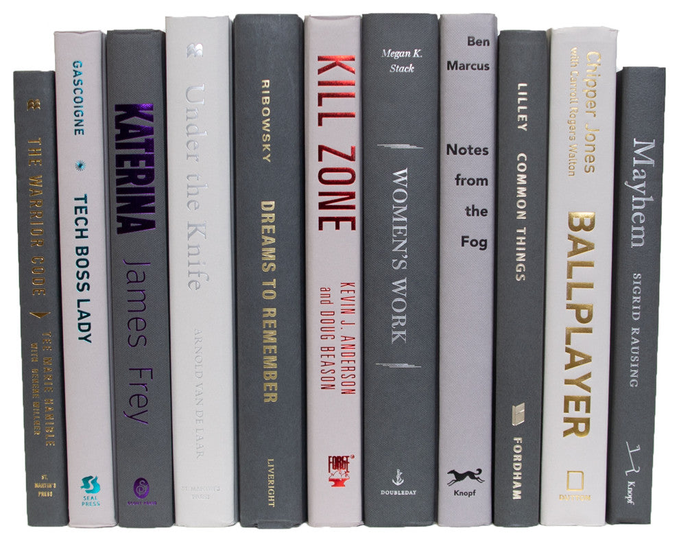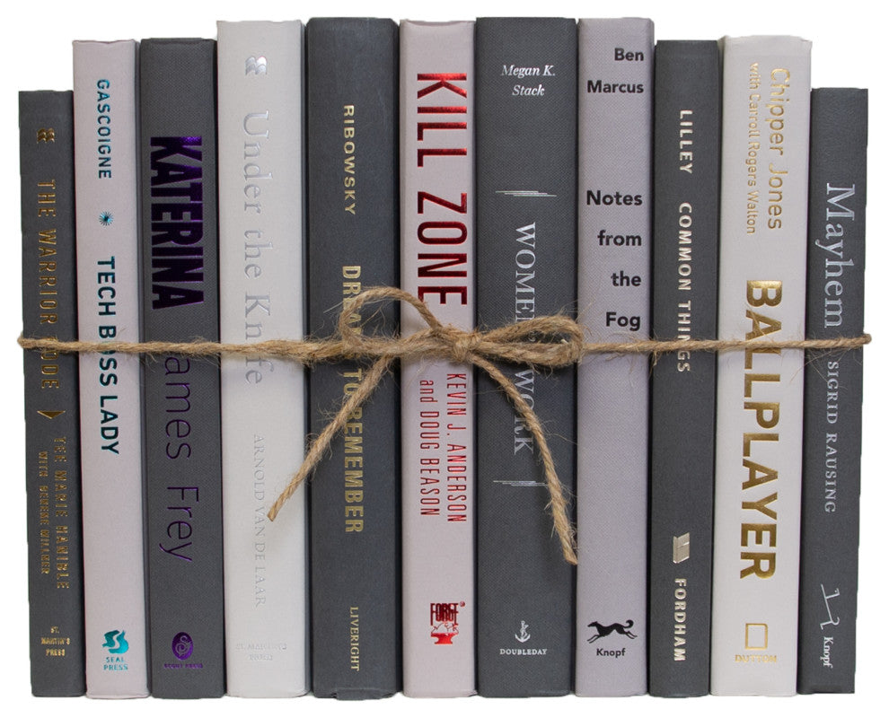 Take your design to a new level with the Modern Granite ColorPak from Booth & Williams. One linear foot of authentic modern hardback books in crisp shades of light, medium and dark grey. All books are published 1980-present and include a variety of literary works, period novels and topical texts with light overall wear. Contains 10-12 books with an average height of 8.5-9.5" and hand-wrapped in jute twine. Order as many ColorPaks as you need to complete your project. Titles will differ from those pictured. If ordering multiple quantities titles may be duplicated.