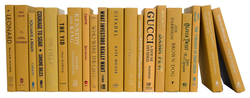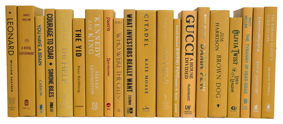 Transform your space with our Modern Saffron: Color By The Foot. Order as many linear feet as you need to complete your project. Authentic modern hardback decorative books in crisp and blended mustard shades. All books are published 1980-present and include a variety of fiction and non-fiction titles. Each linear foot contains 10-12 books with an average height of 8.5-9.5". Titles will differ from those pictured. Standing at the timeless intersection of vintage and vogue is Booth & Williams - proudly offering distinctive vintage and modern book decor to homeowners and designers! Shop our beautiful decorative books, including vintage coffee-table books, curated collections of old books and a large selection of modern book decor, including our best-selling Vintage and Modern ColorPaks and Book Walls!
