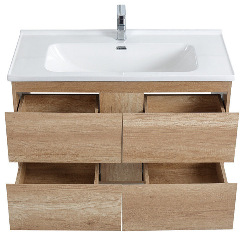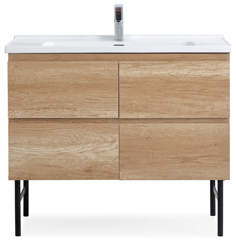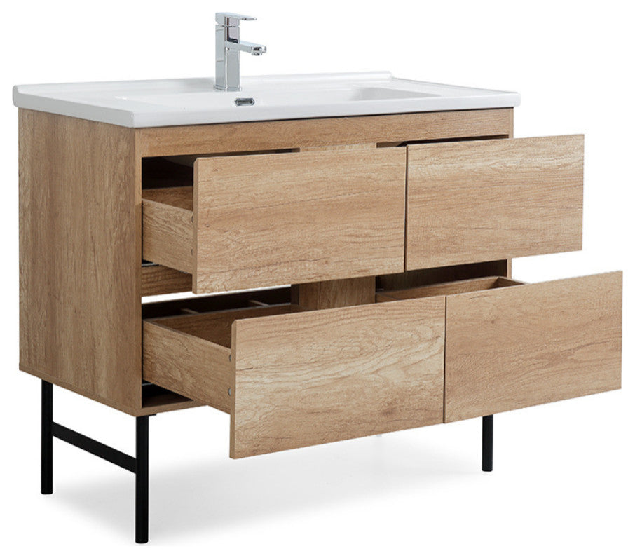 Dimensions: 40 in. W x 18.5 in. D x 35 in. HElevate your bathroom with the 40 Inch Modern Style Elvora Bathroom Sink Vanity, a stunning combination of modern design and natural warmth. Featuring a wood finish and sturdy black metal legs, this vanity adds a sophisticated touch to any bathroom decor. The solid surface integrated top provides a seamless, durable surface, while soft-closing drawers ensure a quiet, refined experience. Perfect for those seeking both style and functionality, this vanity is a bathroom upgrade made to impress.Key Features:-Dimensions: Measures 40 in. W x 18.5 in. D x 35 in. H, offering ample storage and countertop space ideal for everyday use.-Modern Wood Look Finish: Wood grain-inspired finish adds a warm, natural aesthetic that complements a variety of decor styles.-Partial Assembly Required: The metal legs require partial assembly, making setup straightforward and secure.-30mm Thick Solid Surface Integrated Countertop: This thick, durable countertop includes an overflow hole, ensuring both functionality and an elegant look.-Compatible with Single Hole Widespread Faucet: Designed to work with a single-hole widespread faucet setup (faucet set not included)-Soft-Closing Drawers: Enjoy a smooth, quiet close every time with a soft-close mechanism, adding to the vanity"™s quality feel and durability.-Sturdy Metal Legs: Black metal legs provide stability and a modern industrial touch, enhancing the overall look.Included Components:-White Solid Surface Integrated Countertop-Black Metal Legs-Back Opening for Plumbing Access