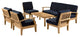 Harbor your greatest expectations with this luxurious solid teak wood outdoor set. Marina has a seating arrangement perfect for every member of your crew as you breathe the fresh crisp air of a day spent with friends and family. Known for its natural ability to withstand extreme weather conditions, teak is the wood selection of choice for long-lasting outdoor furnishings. Now you can enjoy Marina''s durable construction and all-weather cushions, alongside a modern design that persistently looks new and welcoming. Zoom in on the product image before you, and see the exquisite texture and detail for yourself.Solid teak wood construction, Richly textured wood grainingWater & UV Resistant Cushions, Machine Washable CoversOverall Middle Sofa Dimensions: 25"L x 32.5"W x 31.5"HOverall Left-Arm Sofa Dimensions: 30.5"L x 32.5"W x 31.5"HOverall Right-Arm Sofa Dimensions: 30.5"L x 32.5"W x 31.5"HOverall Armchair Dimensions: 31.5"L x 32.5"W x 31.5"HOverall Coffee Table Dimensions: 23.5"L x 47"W x 17.5"HSeat Dimensions: 31"L x 26"W x 12"HBackrest Height: 20"HArmrest Height: 12"HFloor to underside of table: 14.5"HTable top thickness: 1"HOverall Product Dimensions: 150"L x 90"W x 31.5"H