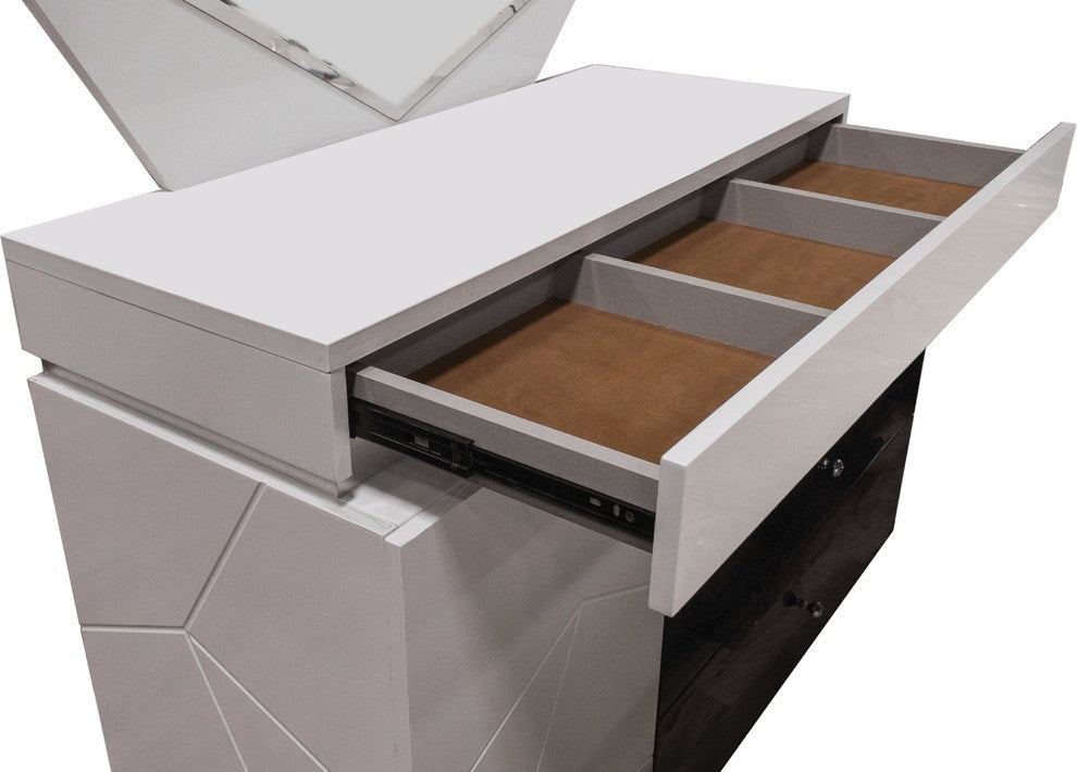 Designed with modern and glamorous touches, this beautiful Dresser and Mirror set offers a upgrade appeal to any bedroom set. It is made of poplar wood with lacquer, mdf and covered in high gloss. All drawers comes with metal side rails and plenty of storage for your clothes and personal belongings. All handles are made with crystal like studs to give it the glamorous touch.DimensionsDresser 54" L x 18" D x 37" HMirror 37" L x 1" D x 37" HColor: Black/ WhiteMaterial: Poplar Wood, MDF, Lacquer, High Gloss, Metal RailsIncludes: Dresser and MirrorAssembly Not Required