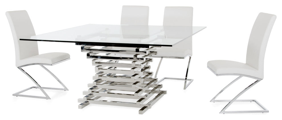 The Modrest Crawford Contemporary Clear Glass Square Dining Table features an enticing tiered chrome stainless steel base that supports the 15mm glass top. Requiring some assembly, this dining table can accommodate 4 people comfortably and has a dimension of W59" x D59" x H30".