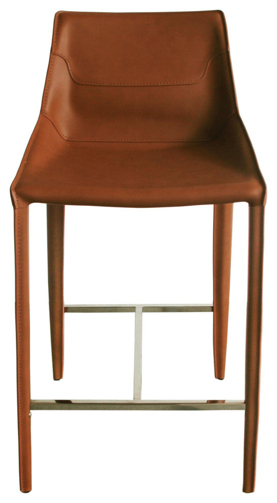 This minimalist counter stool features a cognac brown Saddle Leather covering and stainless steel footrest that is sure to provide lasting comfort. The straighforward design is highlighted by contoured seams that mold the back rest and adds visual interest without being distracting. This Wingback style is the perfect addition for any modern kitchen island with no assembly required. Black plastic glides ensure your flooring is protected for years to come.