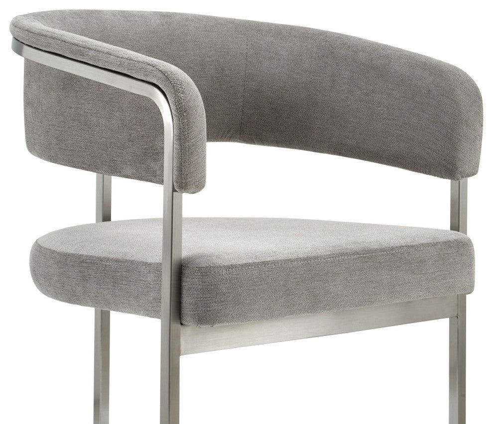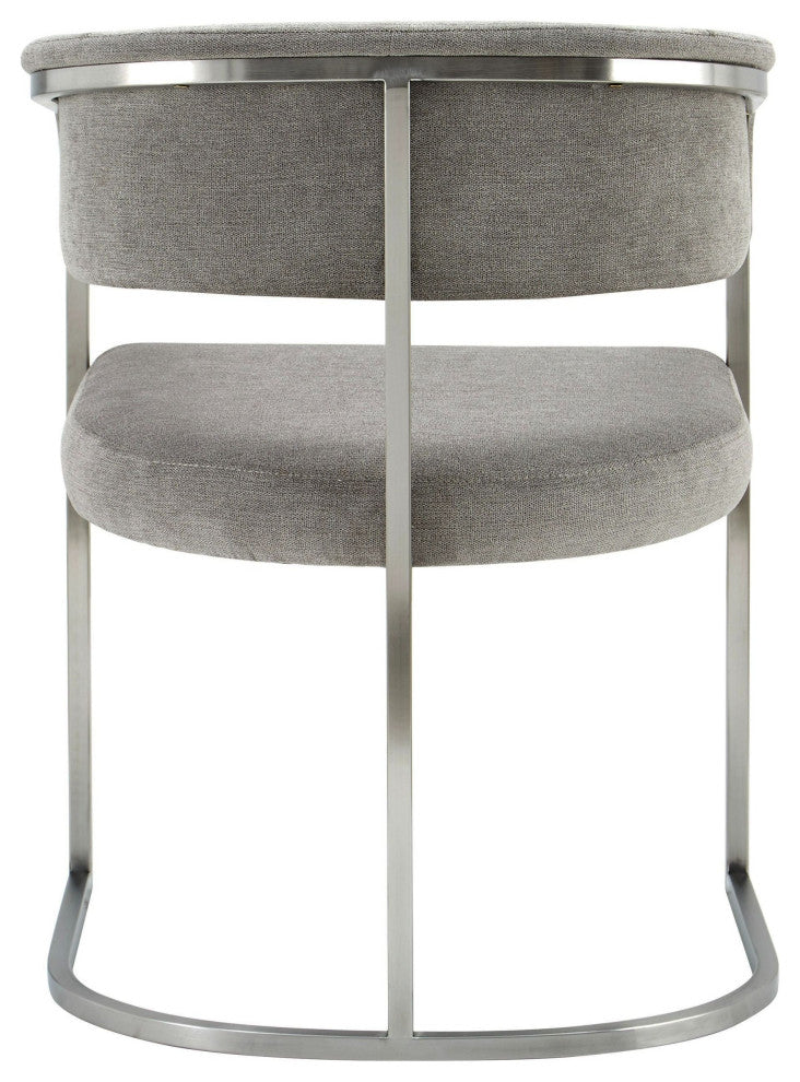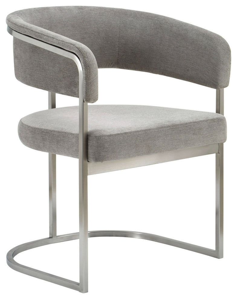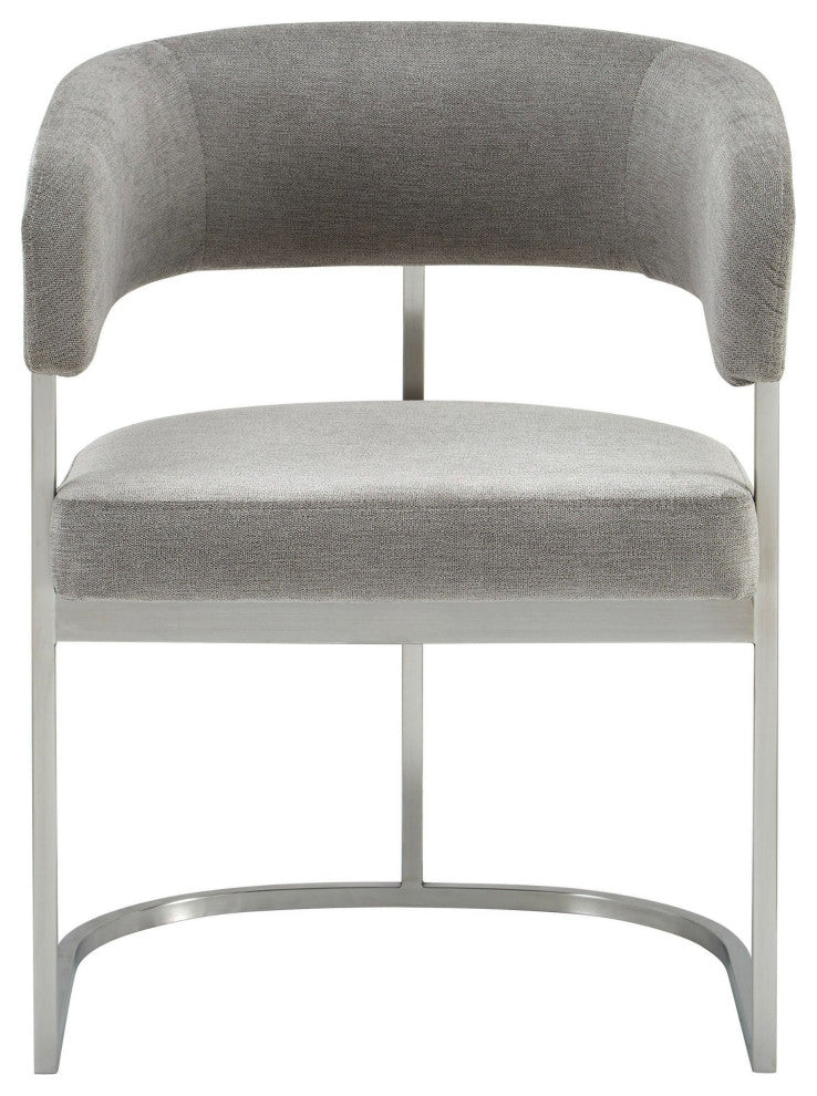 The Modrest Sebastian dining chair exudes contemporary elegance with its modern grey fabric upholstery and sleek stainless steel frame. Featuring a gently curved back and armrests, this chair offers both comfort and style, making it a perfect addition to any dining space. The minimalist design highlights clean lines and a sophisticated aesthetic, while the combination of fabric and metal creates a chic, inviting atmosphere. This versatile chair is ideal for modern interiors, seamlessly blending functionality with visual appeal.Upholstered Dining Side ChairUpholstered In 100% PolyesterColor: Grey Palo StoneStainless Steel Base In Brushed FinishSeat Fill: FoamCross BackWeight Capacity: 275 Lbs.Fully AssembledDimensions:W22.4" x D23.2" x H30.7"Seat Height: 18.9"Seat Width: 18.5"Seat Depth: 21.5"