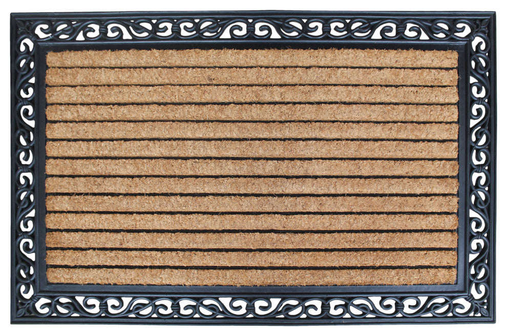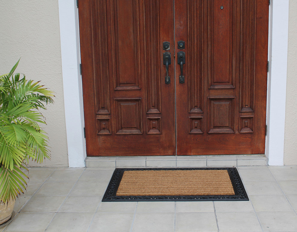 More than a decorative enhancement this rubber and coir molded doormat is made with a heavy rubber backing that anchors it in place while you brush dirt and debris from shoes and boots. The tufted coco-fiber facilitates scrubbing soles clean.>100% COCONUT COIR FIBER : Natural fiber face provides the perfect surface for guests to wipe their shoes before entering your home.>HEAVY-WEIGHT MOLDED RUBBER BORDER firmly anchors the mat in place.>PLACE BEFORE EVERY EXTERIOR DOOR : Use on a patio, in a garage, laundry room, entryway, and anywhere there is high traffic from outside.Use in covered outdoor areas.>PERFECT SIZE FOR YOUR LARGE ENTRYWAY : Doormat measures 48" X 30"" and is 0.6" thick to allow your door to easily pass over the mat without getting stuck.>DECORATIVE DESIGN : Adds a unique touch to your front door or back door while being very functional.