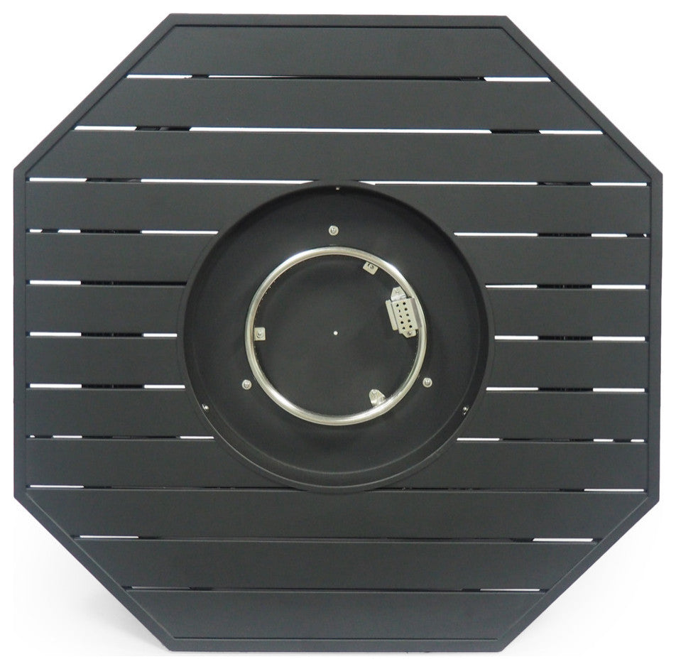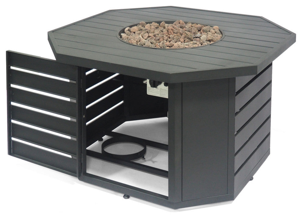 Enliven your evening parties with a little bit of warmth and cozy lighting. Made with iron slats, our 50,000 BTU propane gas fire pit offers an upgrade in style for your outdoor space. This octagonal fire pit is perfect for parties with its easy seating arrangement and built-in tank holder. Whether you want to relax around a warm fire on a crisp night or spend some quality time with family under the stars, our fire pit will have no trouble gathering everyone together for an enjoyable time.IRON FIRE PIT TABLE WITH FINISH: Constructed of powder-coated iron, the frame of this fire pit table is made to be incredibly durable, ensuring that this piece will hold up under use. The frame is finished with a complementing color, making this an understated yet chic addition to your home.TANK SPACE INCLUDED: This fire pit table comes with a built-in space for your propane gas tank. You can enjoy your fire pit table without having to worry about running a hose to the tank or tripping over the exposed tank.50,000 BTU: Featuring an octagonal shape and a BTU of 50,000, our fire pit table allows easy seating arrangement for you and your guests, providing light and warmth all around during those chilly evenings. Please note that this fire pit table is propane gas only.DIMENSIONS: Choose an accessory that is the perfect size for you and your furniture. This fire pit table is 42.00" W x 42.00" D x 24.00" H. You will love how much your space can transform with the simple addition of this charming fire pit table.ASSEMBLY REQUIRED: Some assembly is required for this fire pit table. All of the instructions and tools needed for assembly are included.Includes: One (1) Fire Pit TableMaterial: IronColor: Black50,000 BTUPropane Gas OnlyAssembly RequiredDimensions: 42.00 inches deep x 42.00 inches wide x 24.00 inches high
