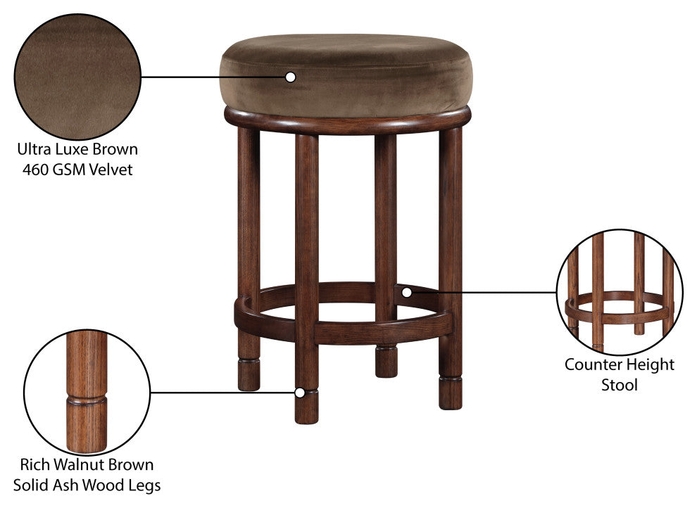 Indulge in the allure of the Brown Velvet Monette Counter Stool by Meridian Furniture. Its captivating design and luxurious Brown Velvet elevate any space with effortless elegance. Crafted with precision and durability in mind, this stunning piece becomes the focal point of gatherings, fostering moments of connection and warmth. Embrace sophistication and style with the Monette Counter Stool, a testament to exquisite taste and timeless beauty.Overall Product Dimensions: 18" W x 18" D x 26" HUltra Luxe Brown VelvetRich Walnut Brown Solid Ash Wood Legs460 GSM VelvetCounter Height StoolContemporary DesignSeat Dimensions: 18" W x 18" D x 26" H