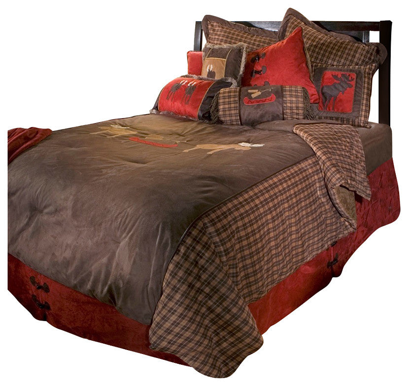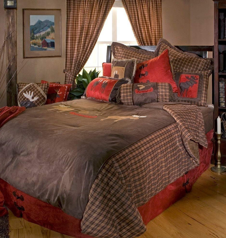 Follow your carefree spirit northward, where large, brown moose freely roam the forests and wetlands. Our Moose Plaid collection is a wonderful dichotomy of warm colors and textures against the moose''s chilly habitat. The comforter is solid brown suede, embellished with moose, canoe, and oar designs. A strong, plaid pattern of brown, tan, and red harmoniously blend the brown top with the red bed skirt. For rustic elegance, look no further than Moose Plaid?where wildlife meets nightlife!Twin Set Includes: Comforter: 67"x89"; Bed skirt: 39" x 75" x 15"; 1 sham: 20" x 27"; 1 pillow: 14" x 26"