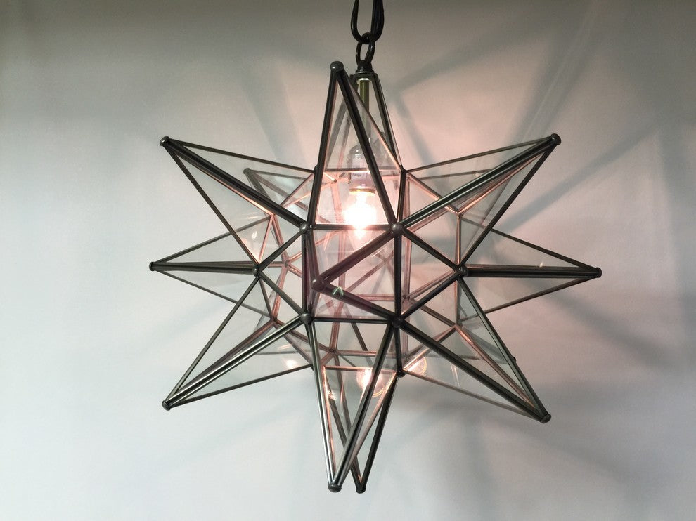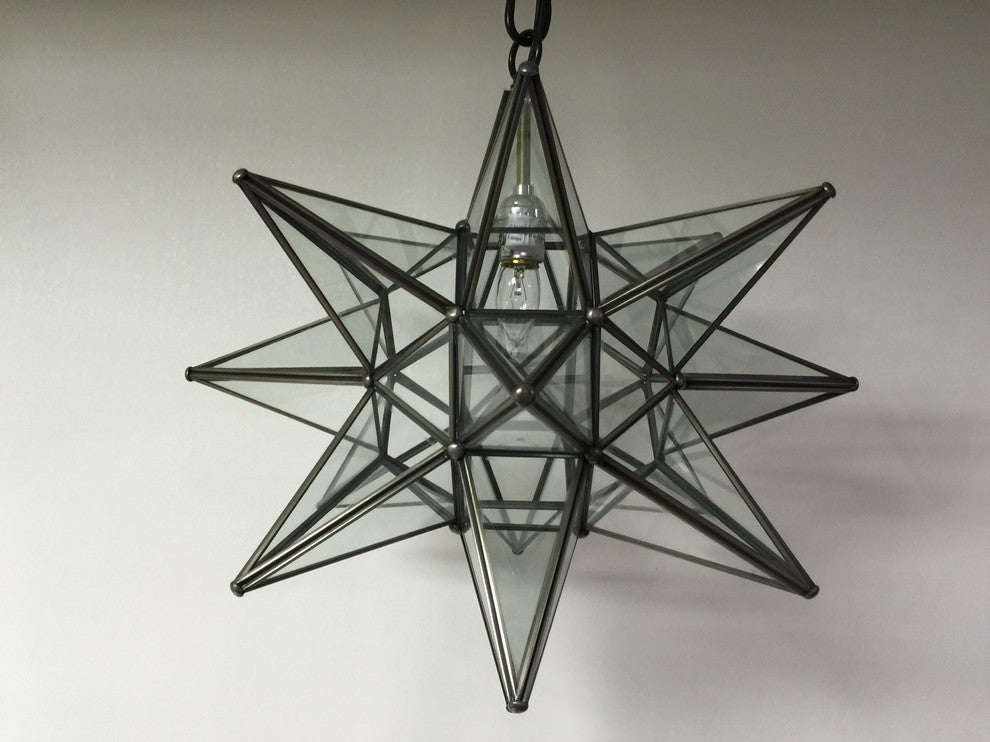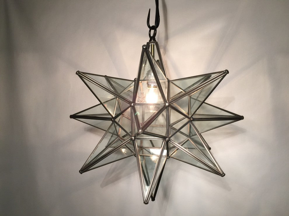 You will love these beautiful and elegant Glass Moravian Star Pendant Lights and the unique ambiance they create! They make an excellent focal point for any room. Clear glass provides the most light, Seedy glass a bit opaque, Frosted glass even more opaque, Antique glass a warm, golden glow that does not provide much light.The bronze trim is a traditional bronze (not a dark bronze) that looks darker when lit. The silver trim is a shiny silver. Please refer to details in the pictures. Features hinged door for easy bulb access. Takes medium base 60W bulb (not included). Can easily be hardwired. Ceiling Mount Kits with variable length up to 24" also available. When purchased with a Ceiling Mount Kit, the light will be wired with an 8'' clear cord that is ready to hardwire and can be cut to the desired length. Let us know if you need a custom length.When purchased without a Ceiling Mount Kit, the light will be wired with an 8'' clear cord with a plug. If you would like it wired differently, please let us know.