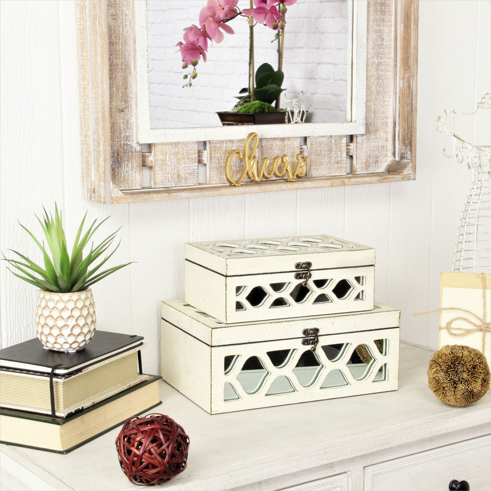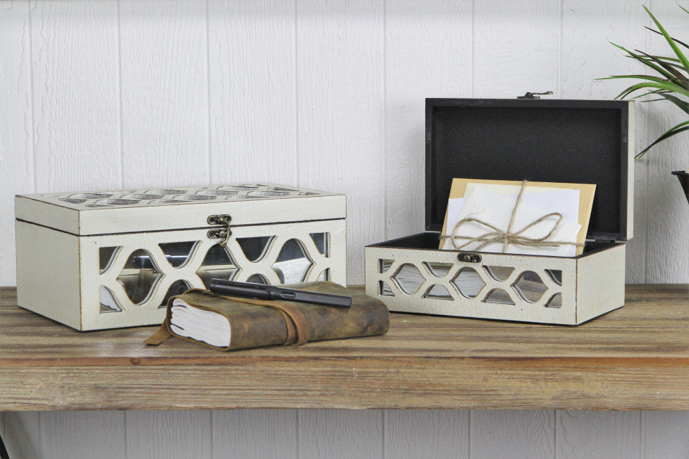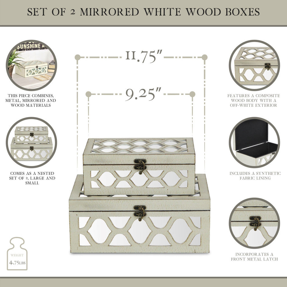 Add an exotic, rustic charm to your home with the Moroccan Mirrored Wooden Boxes. A lovely addition to your bookcase or mantel, these keepsake boxes are the perfect place to store anything from books and jewelry, to childhood photos. Featuring a stunning wood overlay and a sleek, flat top lid, each box provides an element of understated elegance. Mirrored front and top panels add an additional layer of design depth to these stunning boxes, while a distressed finish creates a distinguished, antique look. Sold as a set of two, these nesting boxes make for easy and efficient storage, while an interior lining and metal hook latch ensure the contents of each box remains safe and secure. Gorgeous and eye-catching accent pieces, the Moroccan Mirrored Wooden Boxes are available in blue, green, orange and white.