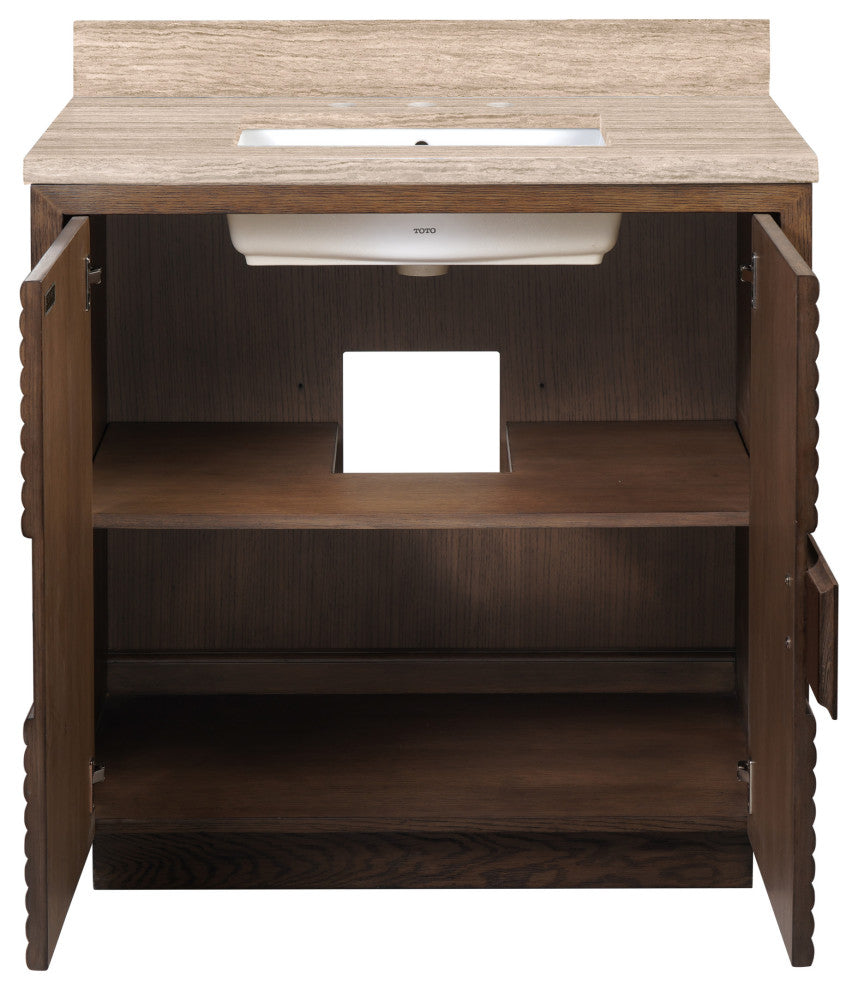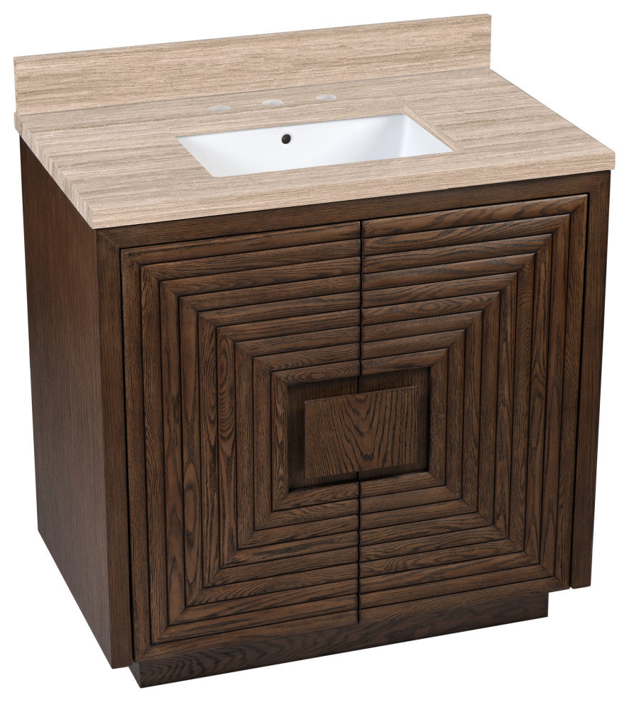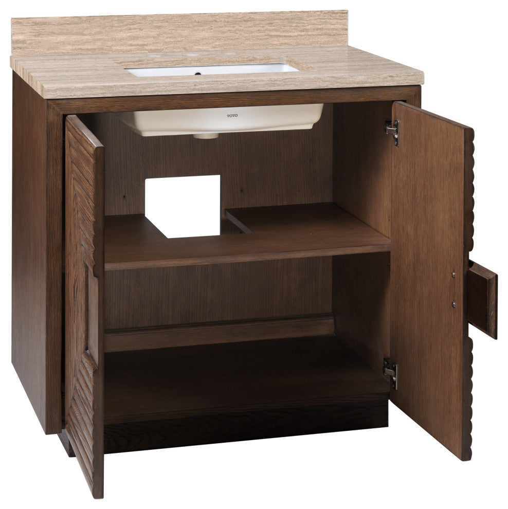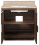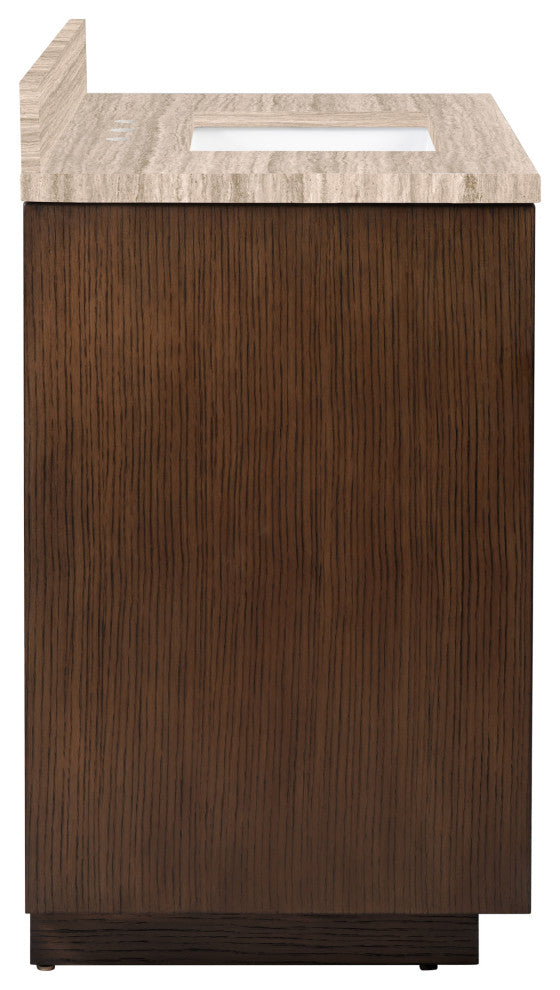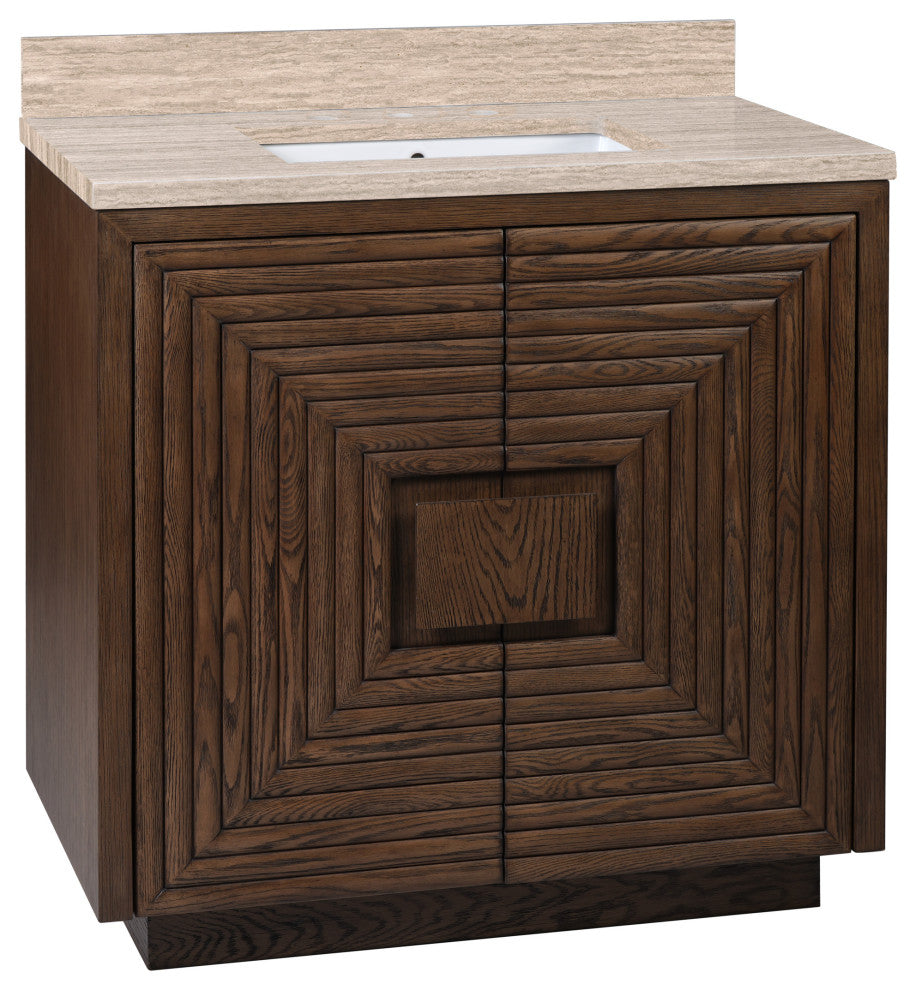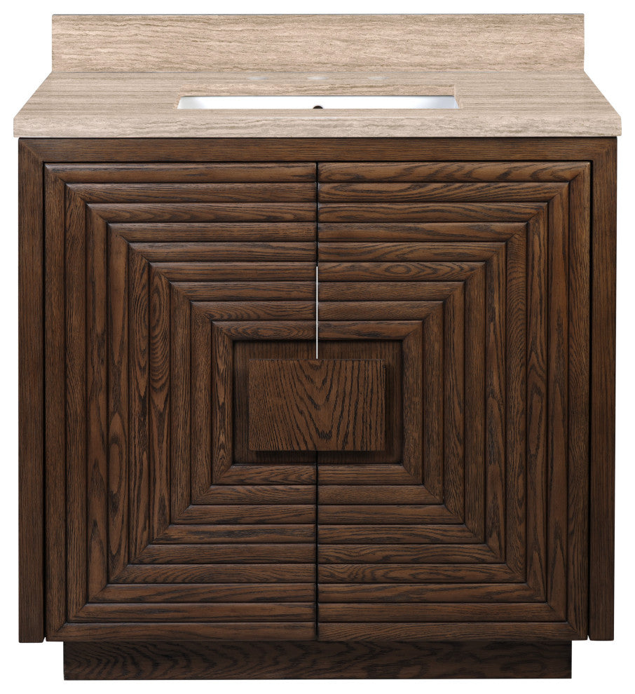 The deep-toned distressed cocoa finish on the Morombe 36" Cocoa Vanity highlights the patterns of natural wood that form embedded squares in a geometric illusion of depth. The interior has one adjustable shelf and there are two optional wood trays that attach to the inside of the doors. The travertine top is fitted with a rectangular undermount sink. Other fine design attributes include soft-close door hinges and a matching marble backsplash.