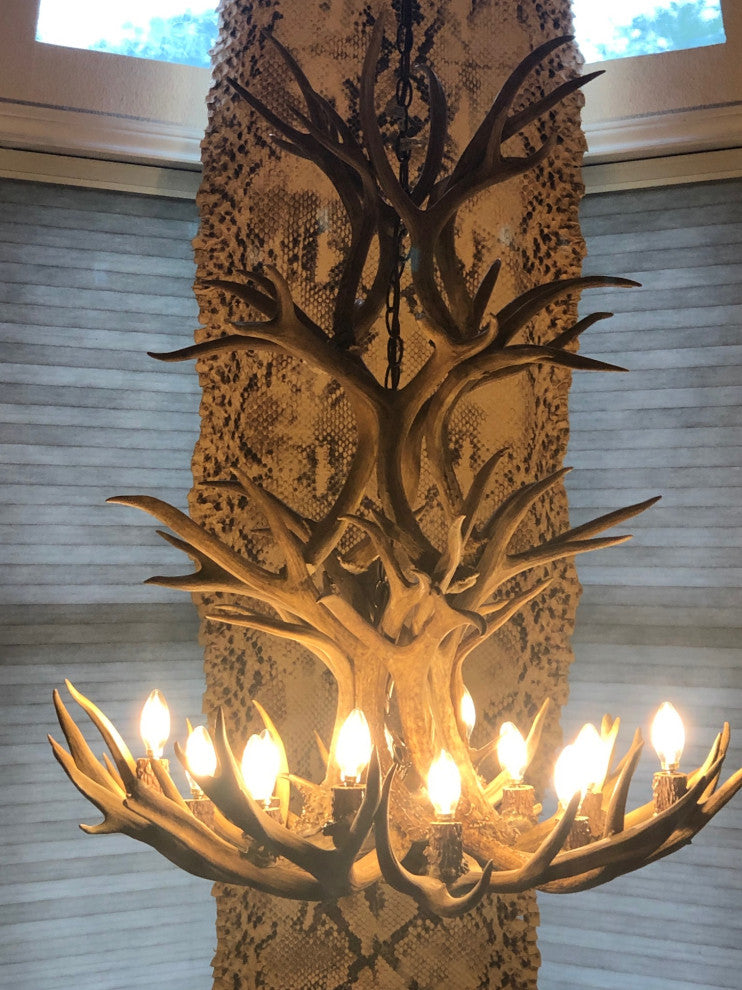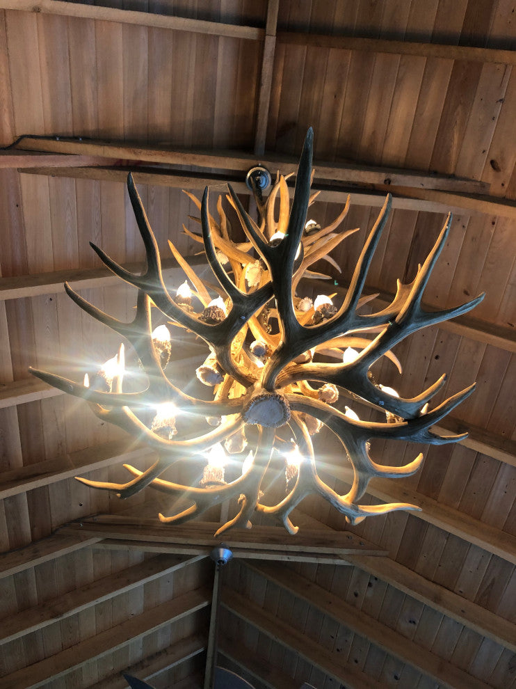 Real Antler Mule Deer Tall Spruce Chandelier (48-52"D x 50-53"H), 12 light sockets, 6 feet of rustic bronze chain.Handmade in North America using top quality naturally shed real antlers. Sockets are made to resemble real antler, each socket rated up to 60 Watts. Comes balanced and ready to hang. Frosted Bent Tip Candelabra Bulbs included. Certified in U.S & Canada (CSA listed to comply with UL 1598)