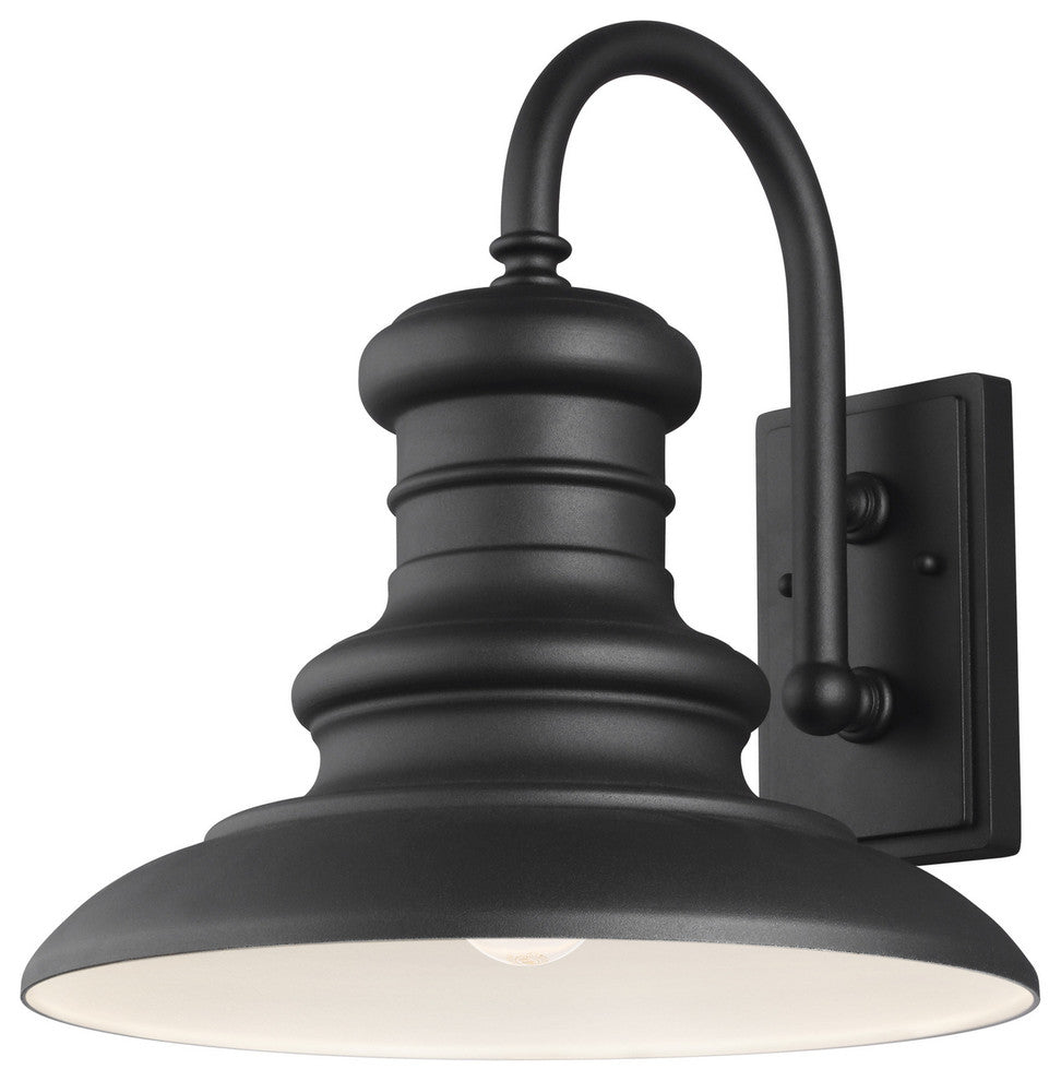 One Light Outdoor Wall Fixture from Redding Station collection in Textured Black finish. Number of Bulbs 1. Max Wattage 100.00. No bulbs included. All Aboard! Reminiscent of old railroad lighting, the Redding Station Collection warmly illuminates its surroundings with a vintage railroad vibe. The all-aluminum shades feature textured details. Redding Station is available in three finish options: Tarnished Silver, Restoration Bronze and Textured Black. No UL Availability at this time.