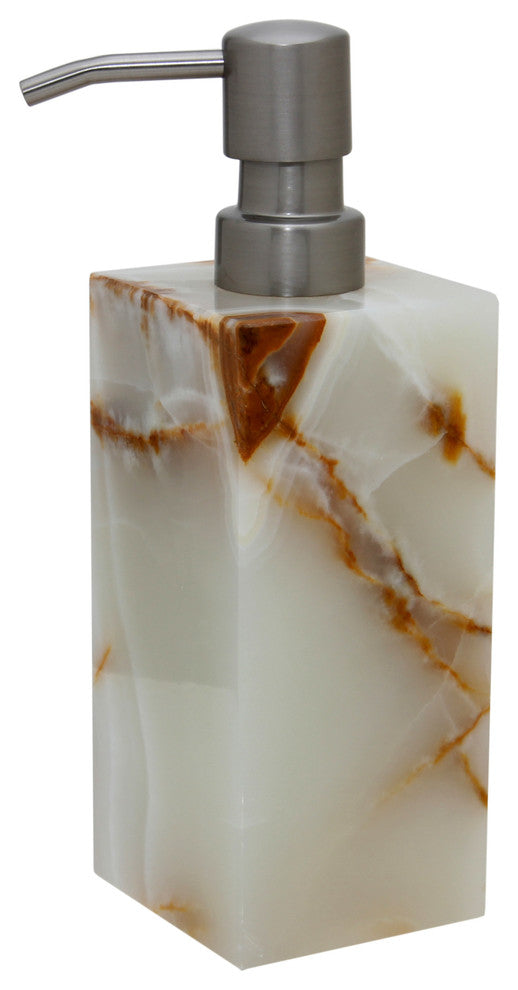 Keep your hands clean and your bathroom counter looking sleek and stylish with our Myrtus Soap Dispenser on display. Crafted from natural onyx, this chic accessory features a pale green and cream color that will provide a refreshing update to your space.