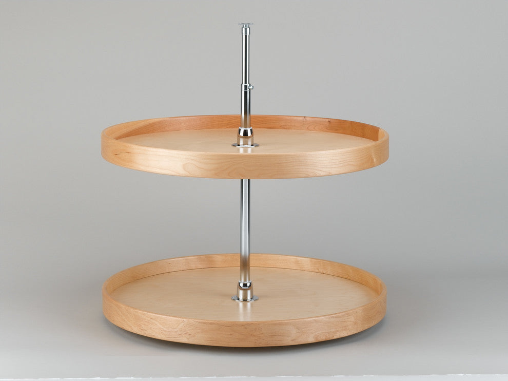 Rev-A-Shelf''s 4NW series lazy susans are at the top of the line when it comes to lazy susans. Whether you are replacing an old unit or just adding a lazy susans to your corner cabinet, you will not be disappointed with the 2-3/8" steam bent rim, 5/8" thick Maple tray bottom, beautiful chrome accent hardware and the overall furniture grade construction. This tray is above the rest.-Included: (2) Shelf Wood Full-Circle set with telescoping shaft and mounting hardware-Independently rotating chrome plated metal hub Included:-Doweled reinforced butt joint for strength-Furniture grade steam bent solid wood rim -Shelves are adjustable once installed from 26" to 31"-Designed for Corner Base Cabinets-Construction: Fully Assembled Maple Wood construction with a clear coat finish for durability-Shelf Weight Rating: 20 lbs. per sqft