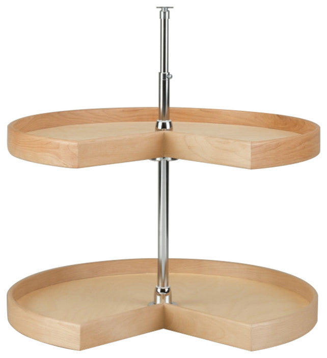Rev-A-Shelf''s 4NW series lazy susans are at the top of the line when it comes to lazy susans. Whether you are replacing an old unit or just adding a lazy susans to your corner cabinet, you will not be disappointed with the 2-3/8" steam bent rim, 5/8" thick Maple tray bottom, beautiful chrome accent hardware and the overall furniture grade construction. This tray is above the rest.-Included: (2) Shelf Wood Kidney-Shaped set with telescoping shaft and mounting hardware-Independently rotating chrome plated metal hub Included:-Doweled reinforced butt joint for strength-Furniture grade steam bent solid wood rim -Shelves are adjustable once installed from 26" to 31"-Designed for Corner Base Cabinets-Construction: Fully Assembled Maple Wood construction with a clear coat finish for durability-Shelf Weight Rating: 20 lbs. per sqft